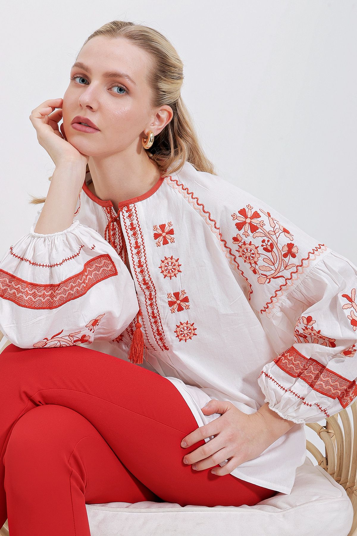 Bigdart Kadın Beyaz Turuncu Nakışlı Keten Bluz 902