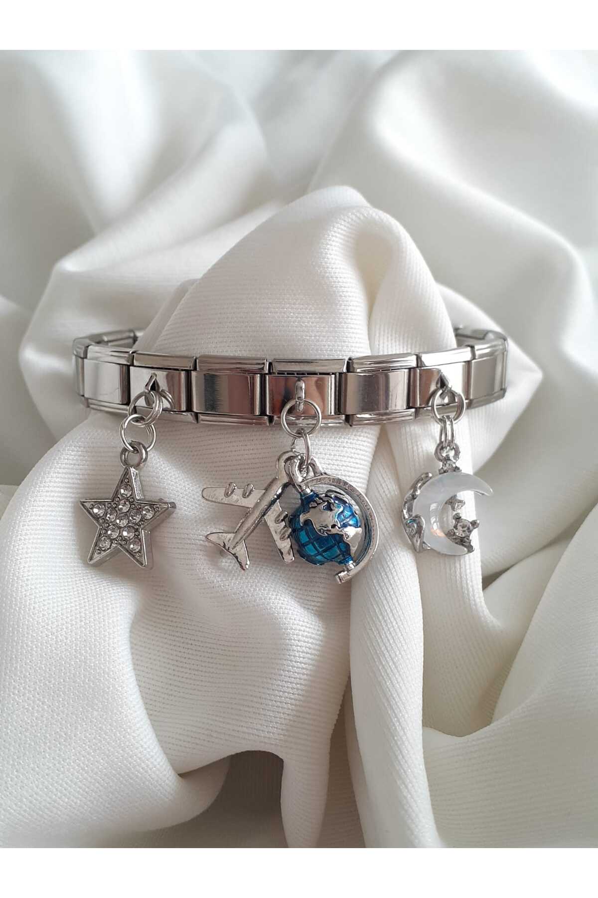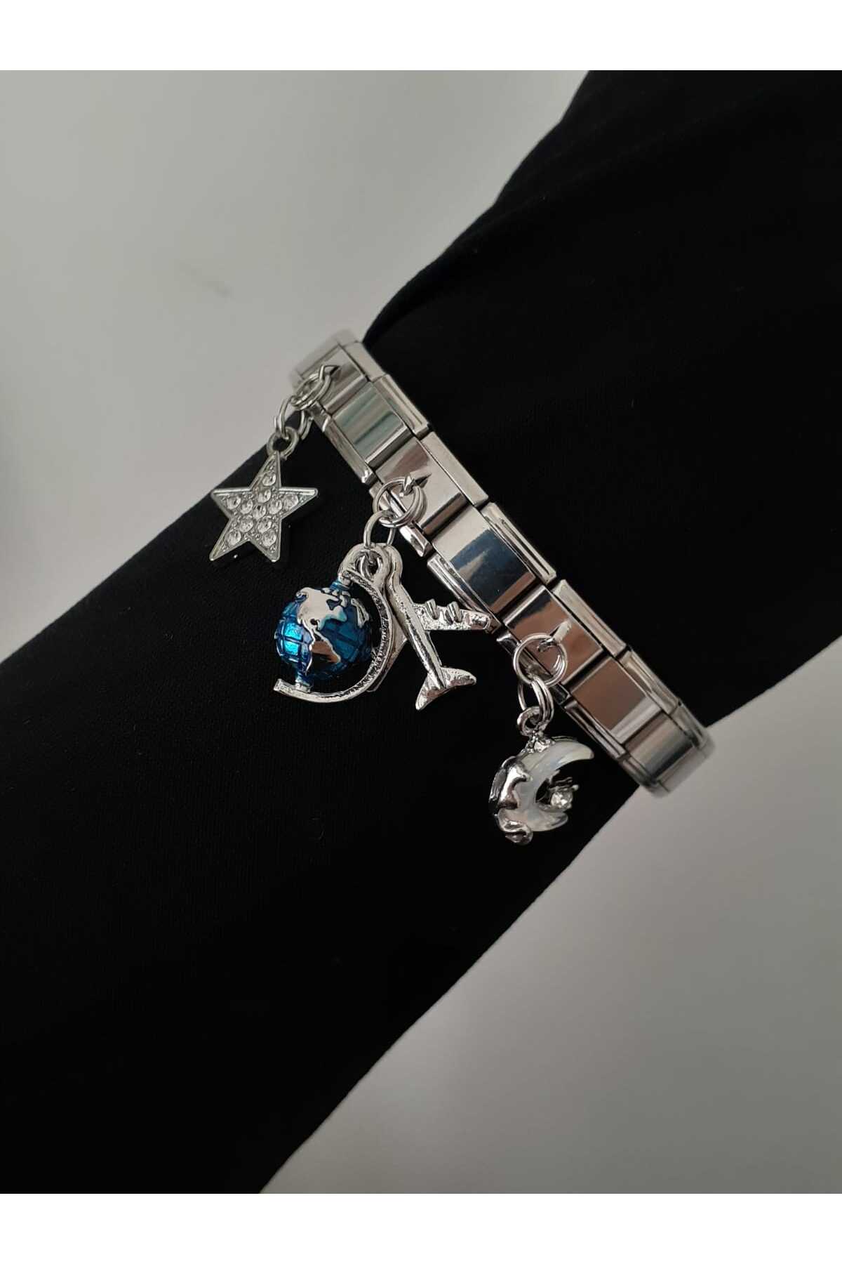 bijoux uniques Uçak&Dünya&Ay&Yıldız Figürlü Çelik italyan charm bileklik