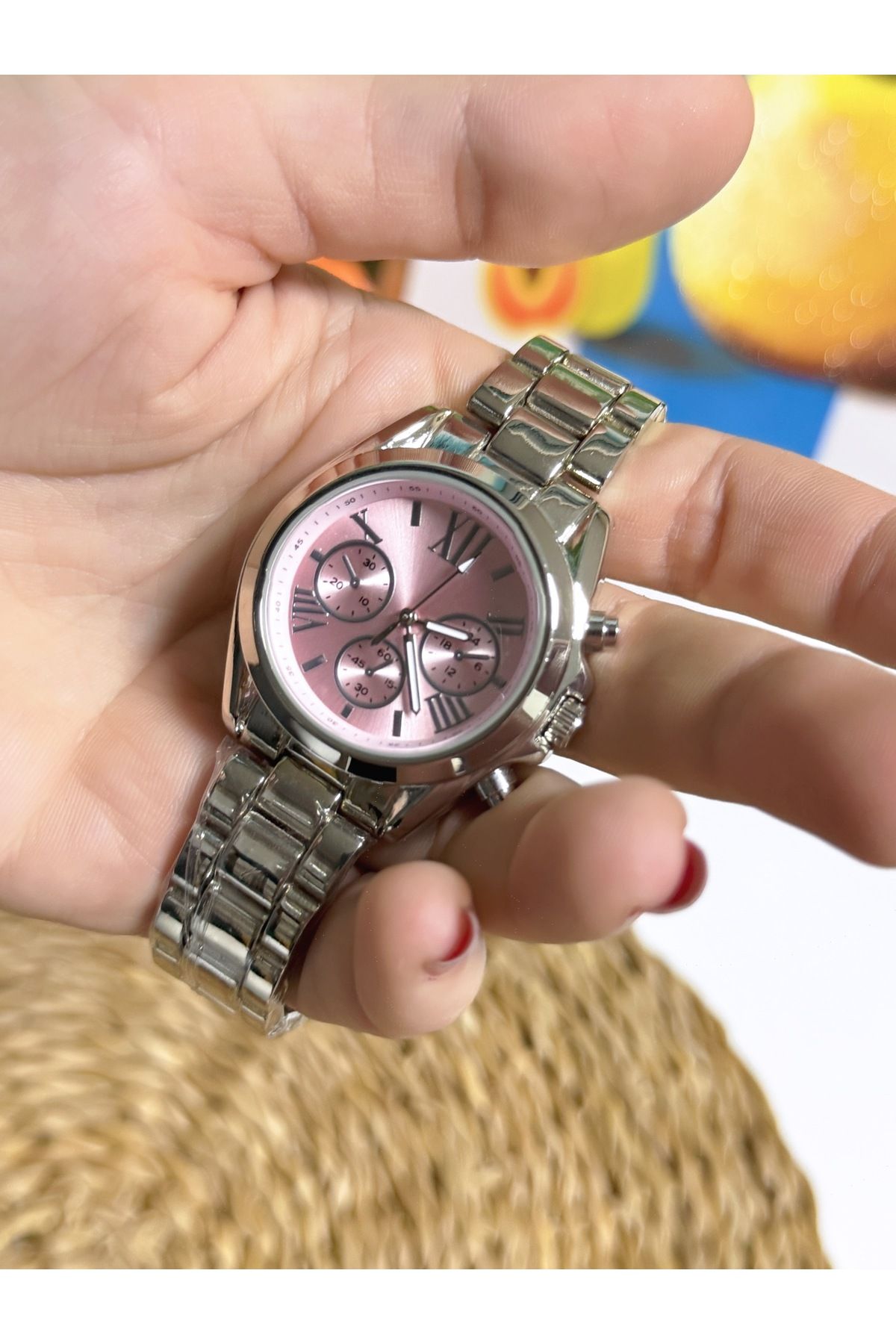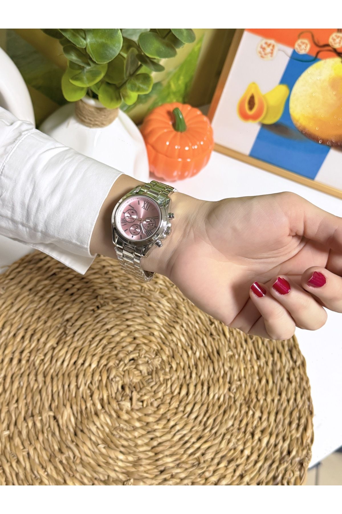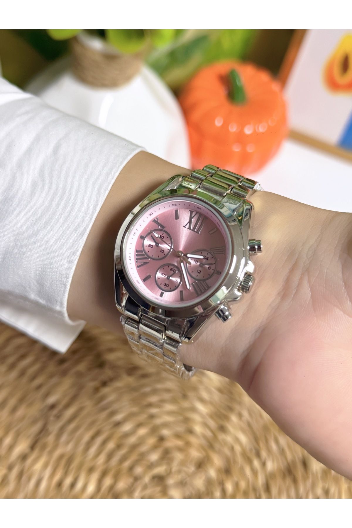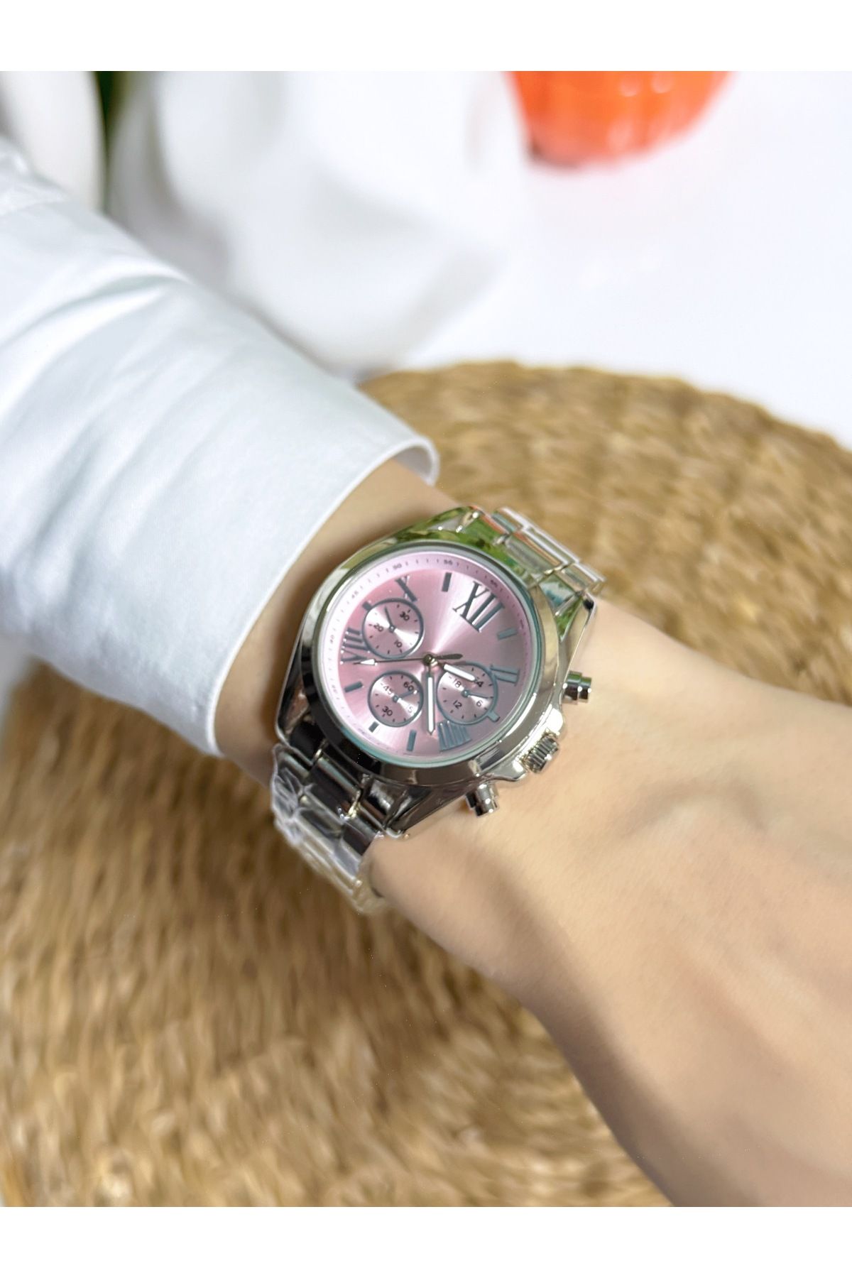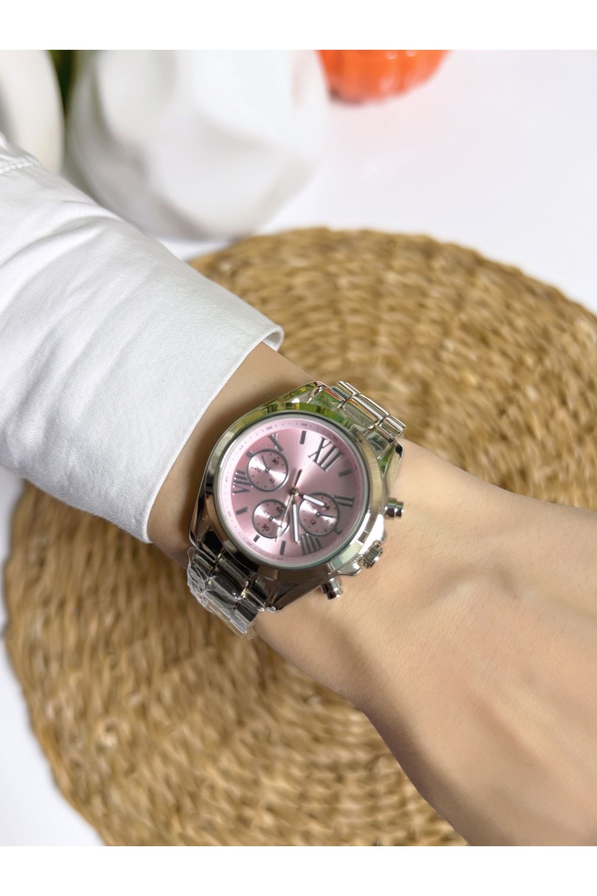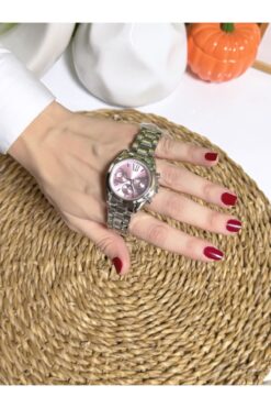 – Gümüş rengi kasa ve kordon, modern ve sofistike bir stil sunarken pembe detaylarla feminenliği ön plana çıkarır.