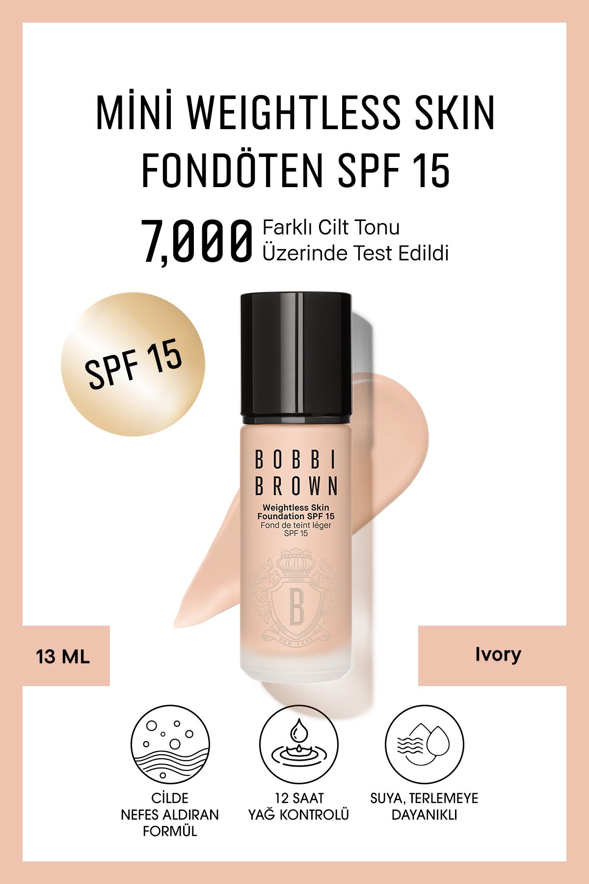 BOBBI BROWN Mini Weightless Skin Fondöten SPF 15 – Doğal ve Mat Bitişli – Ivory – 13 ml (Seyahat Boy)