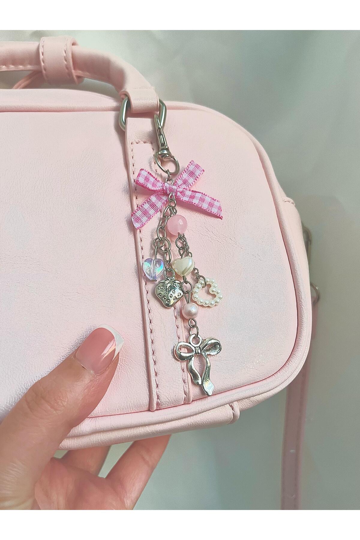bohemian takı tasarim Pembe Ekose Fiyonklu Çilekli Çanta Charmı