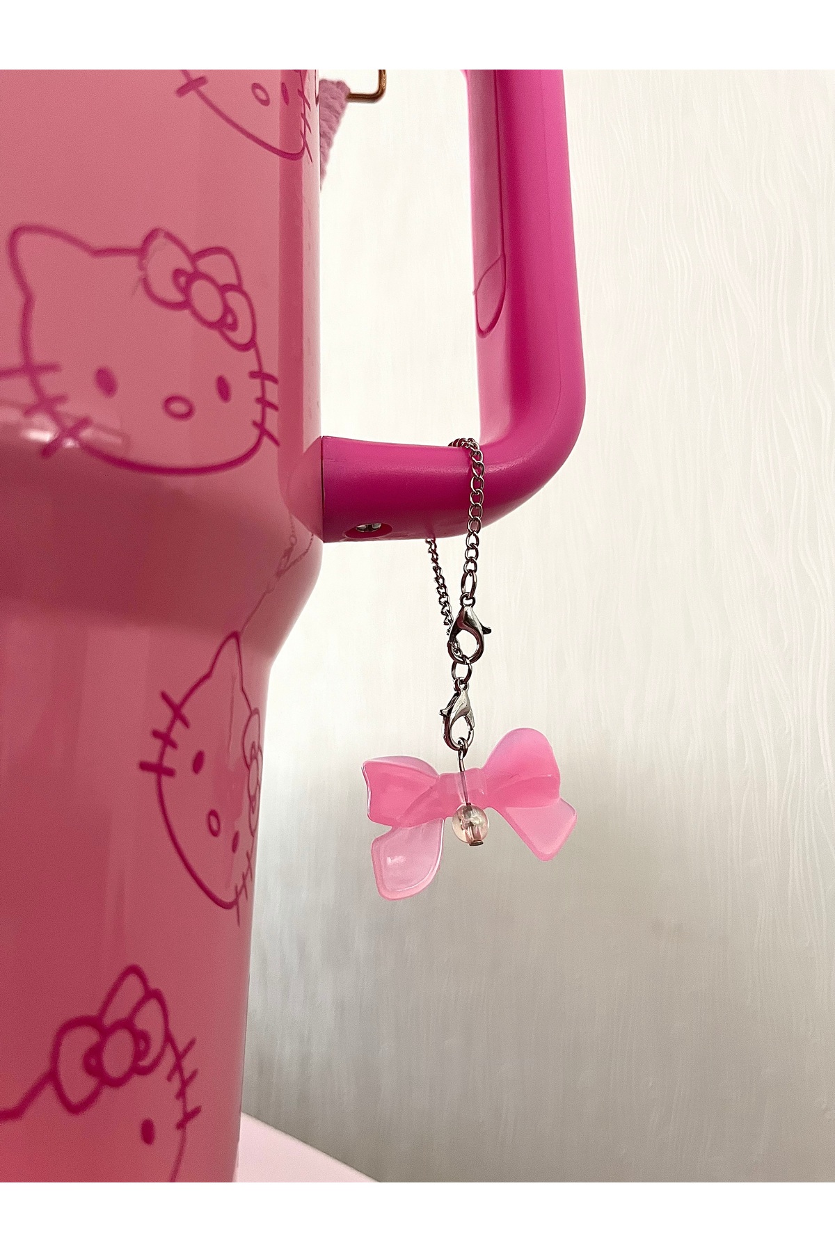bohemian takı tasarim Pembe Fiyonklu Termos Suluk Charmı Çanta Süsü Zincirli Charm