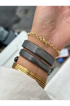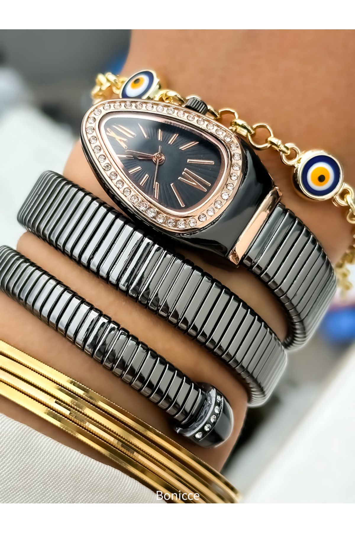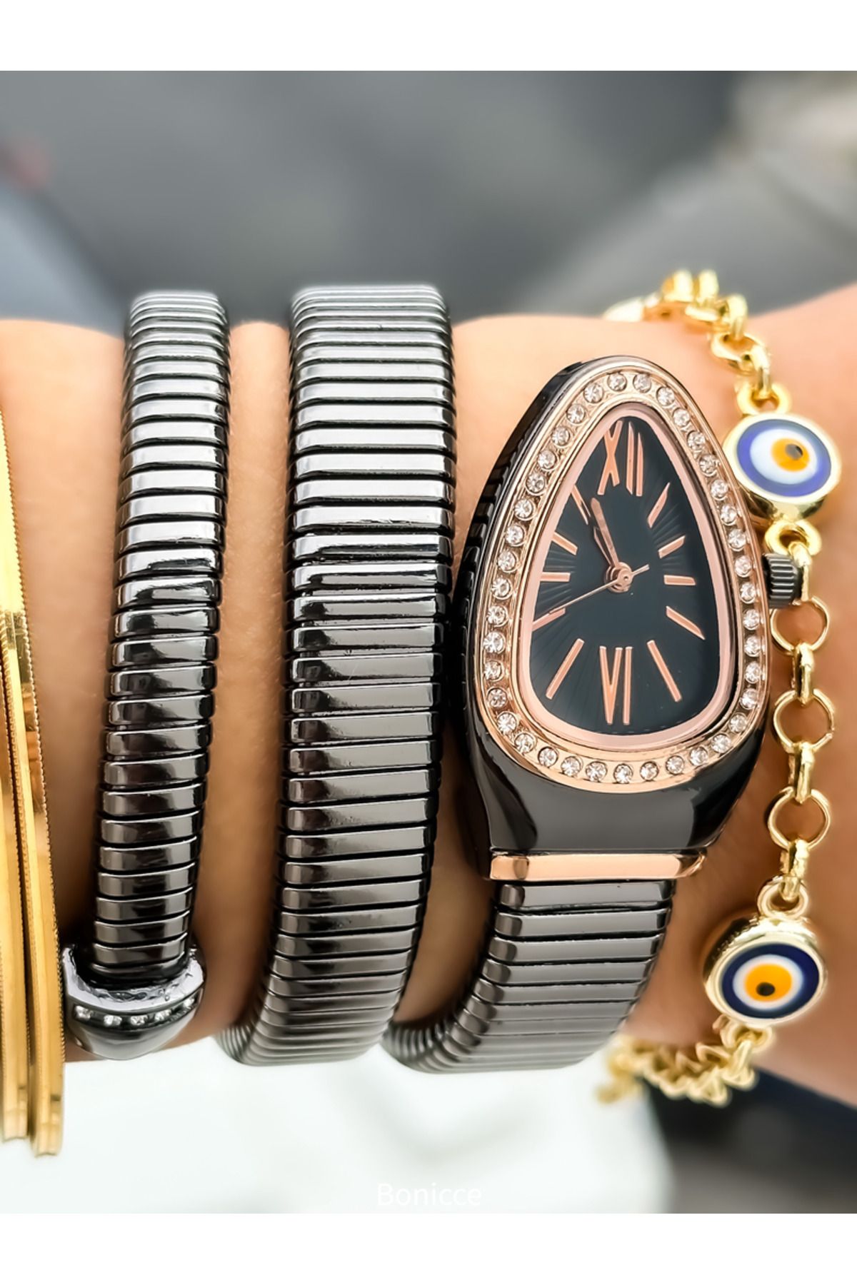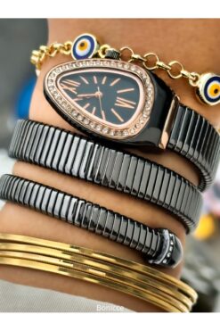 Bonicce Özel Hediyelik Kutuda Füme Renk Taşlı Yılan Model Kadın Kol Saati Bileklik Nazar Boncuklu Bileklik