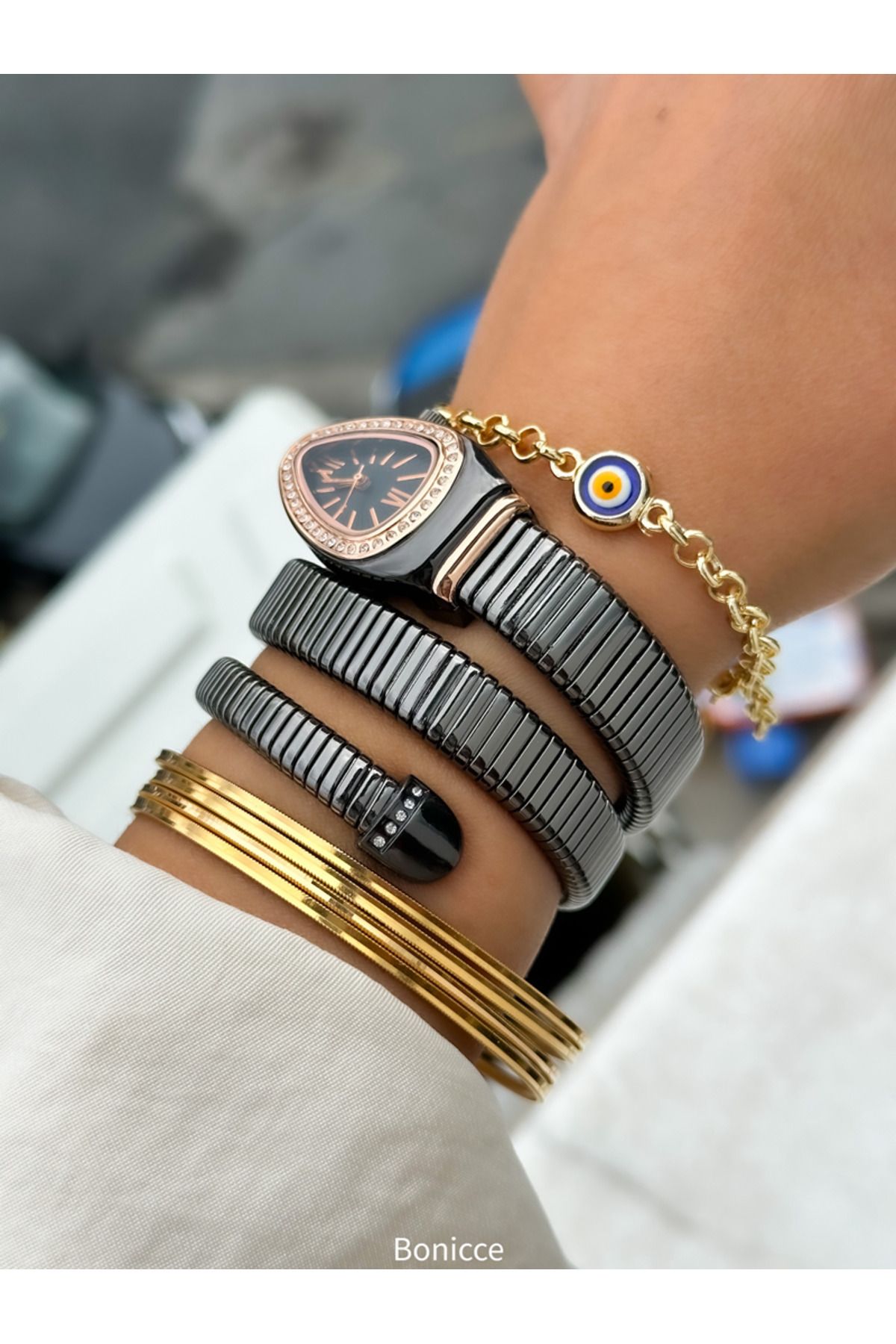 Bonicce Özel Hediyelik Kutuda Füme Renk Taşlı Yılan Model Kadın Kol Saati Bileklik Nazar Boncuklu Bileklik ürününü en uygun fiyata kozmetikara.com sitemizden sipariş verebilirsiniz.