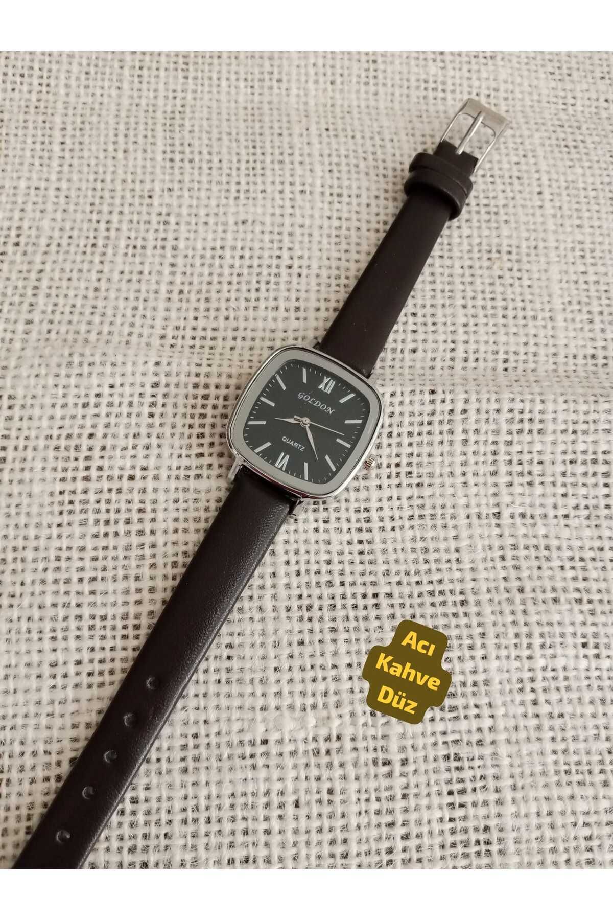 Brality Retro Minimal Vintage Kadın Kol Saati Kare Model… Koyu Kahve Kordon Gümüş Kasa Siyah Kadran 0099