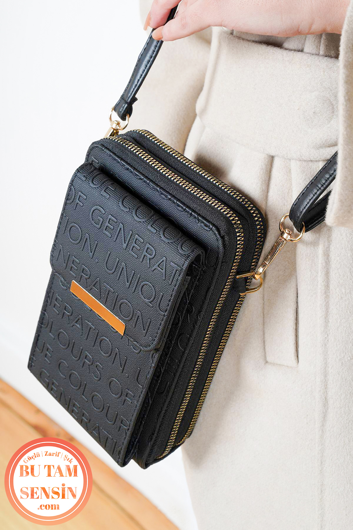 Bu Tam Sensin Siyah Kabartma Yazılı Kadın Mıknatıs Kapaklı Telefon Bölmeli Çapraz Askılı Cüzdan Çanta