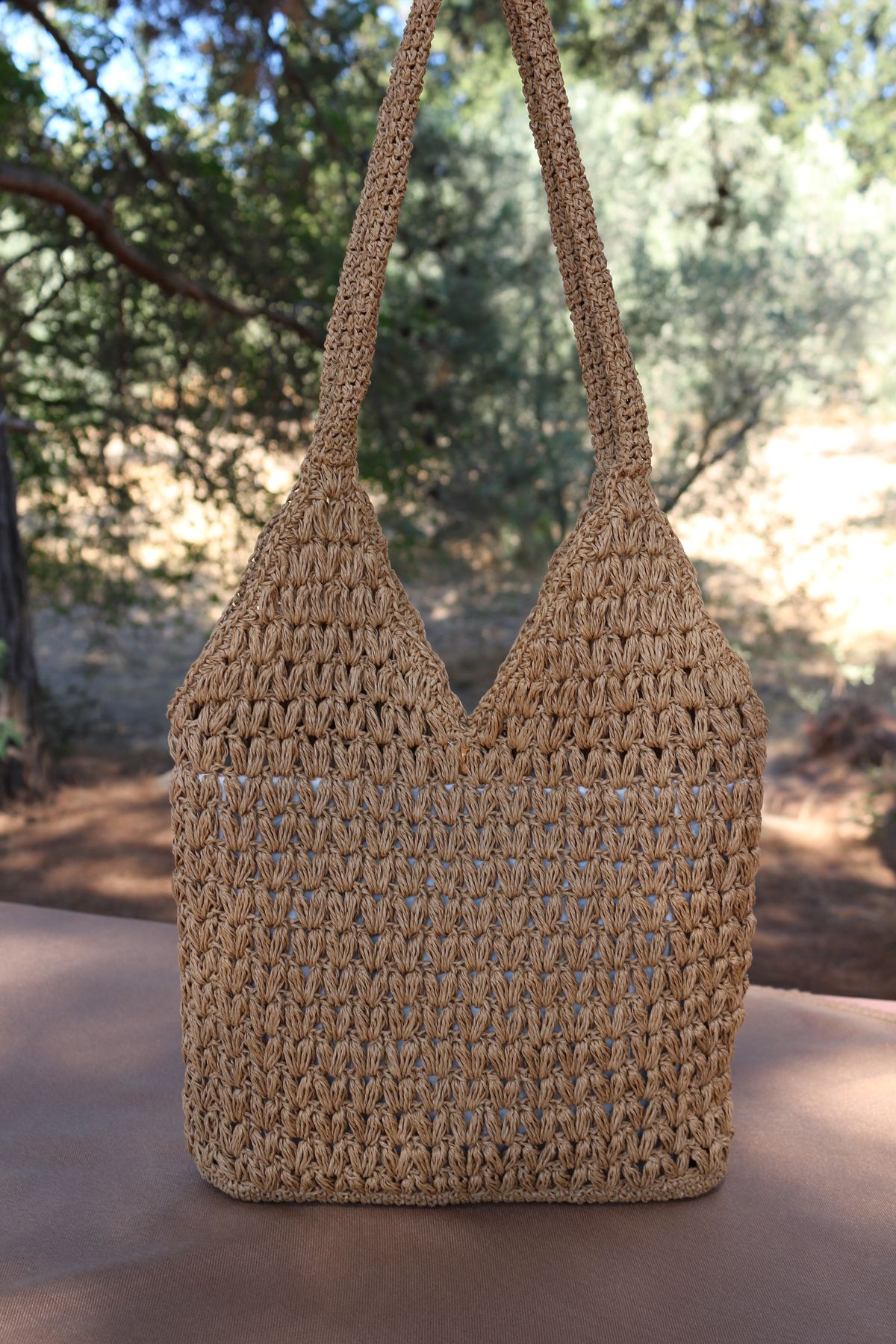 Butik Astarlı Hasır El Örgüsü Şık Çanta Fıstık Model Kağıt Ip