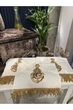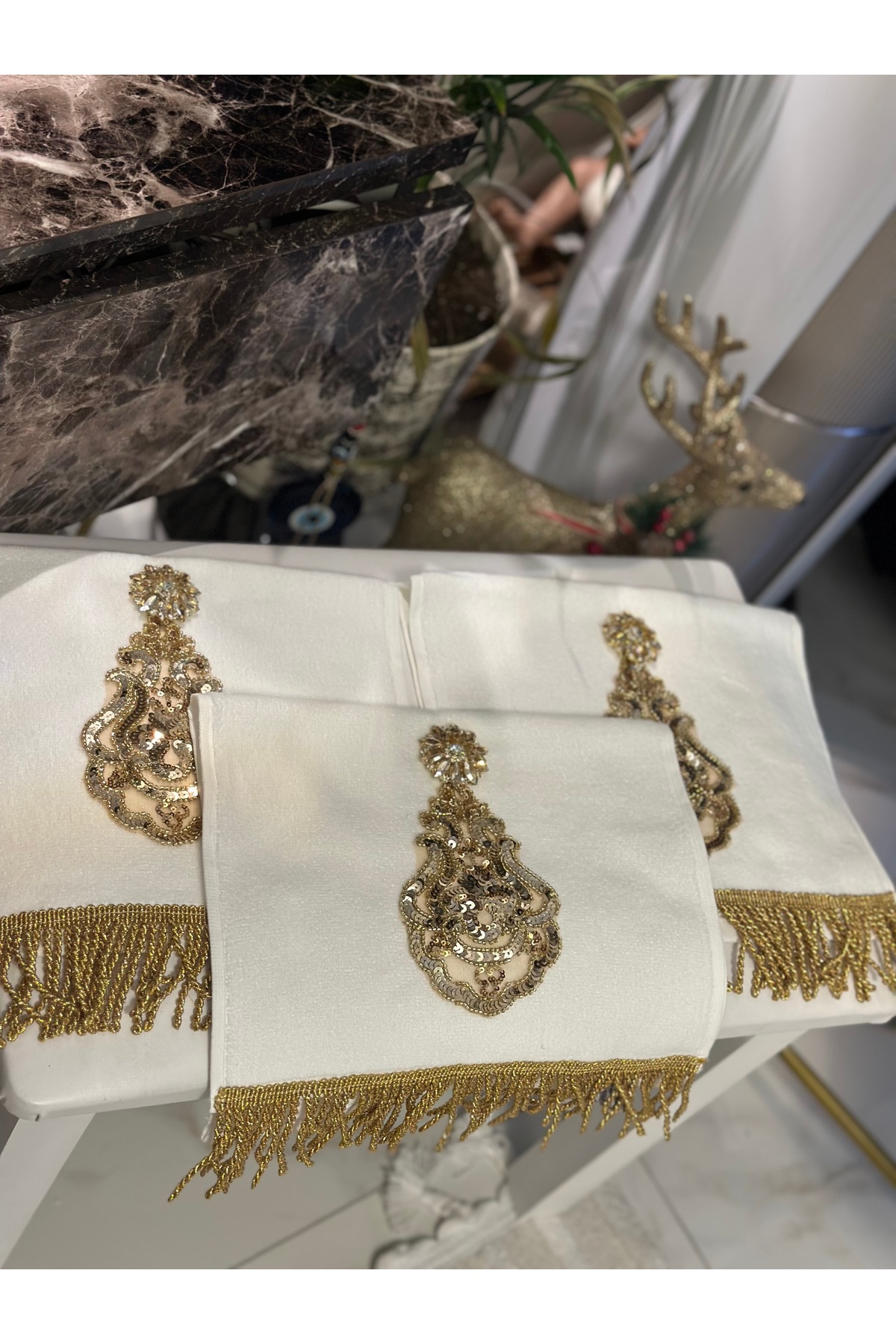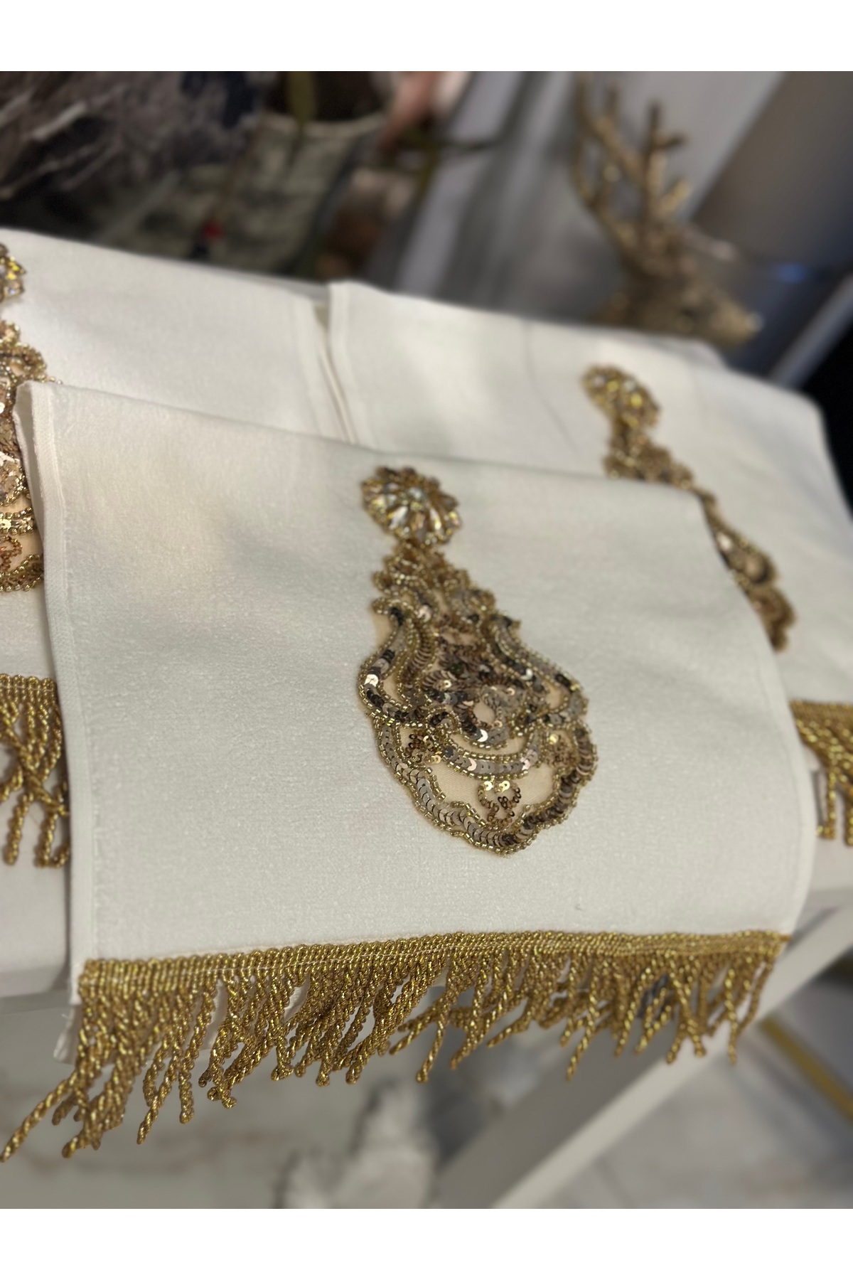 By Serpil Şener 3’lü Lüks Gold Nakışlı & Püskül Detaylı Pamuklu El Havlusu 30×50 cm-Çeyizlik Mutfak ve Banyo Havlusu