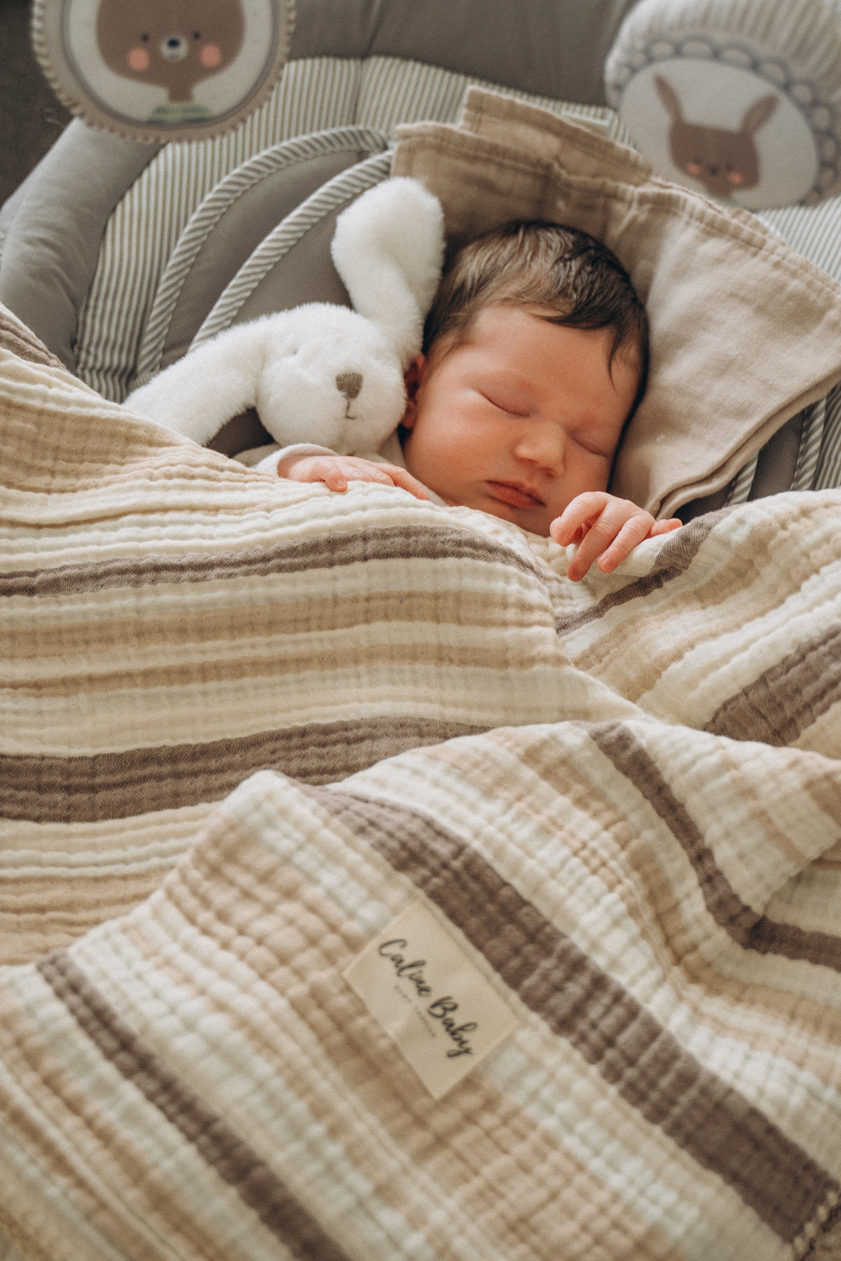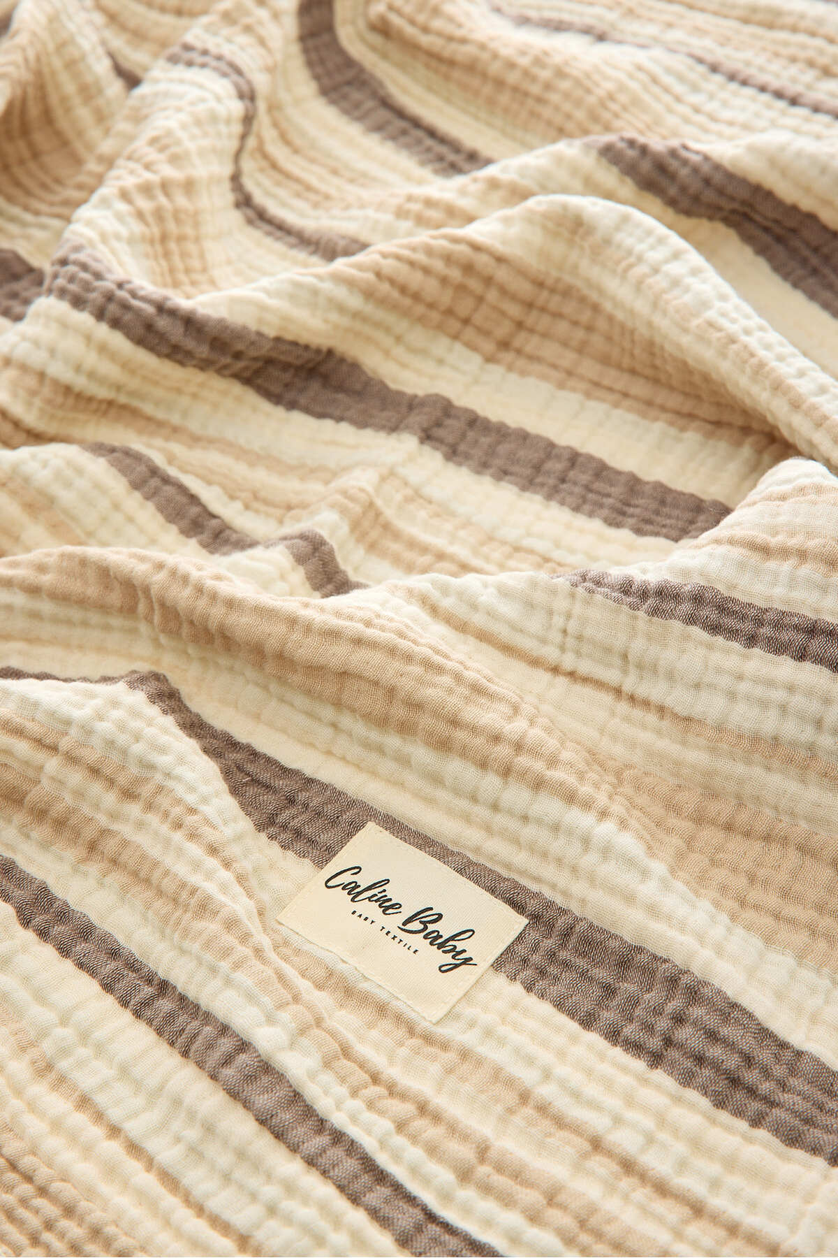 Caline Baby 4 Kat Müslin Battaniye Çizgili Çoban Dikişli 110*110cm - Bej ürününü en uygun fiyata kozmetikara.com sitemizden sipariş verebilirsiniz.