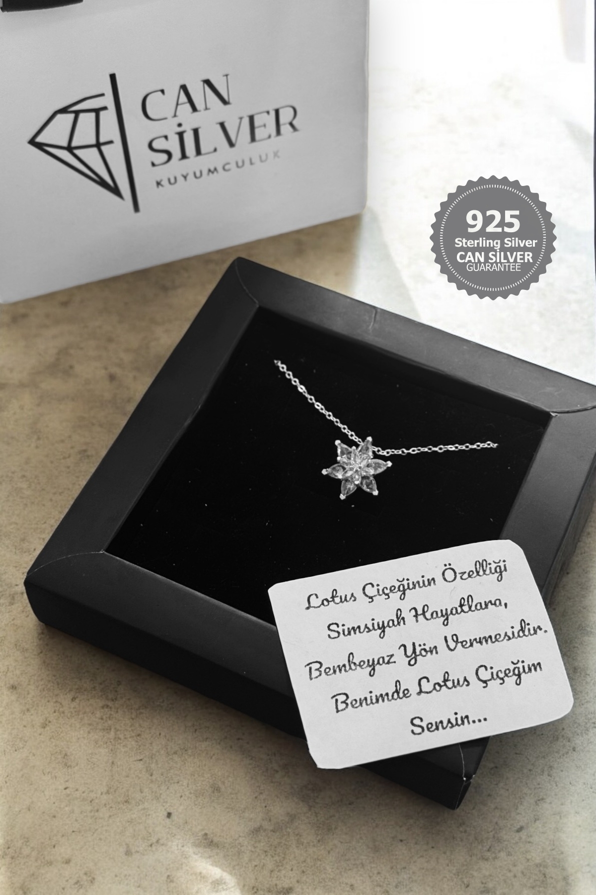 CAN SİLVER Aşk Kolyesi |925 Ayar Gümüş Beyaz Taşlı Lotus Çiçeği Gümüş Kadın Kolye- Hediye Paketli