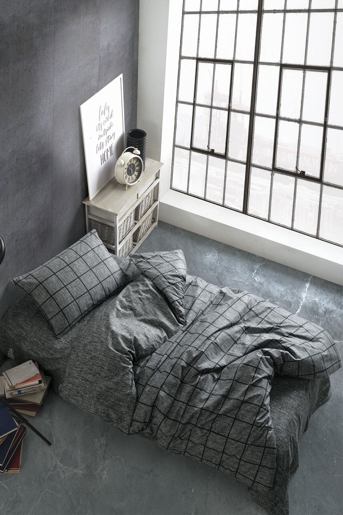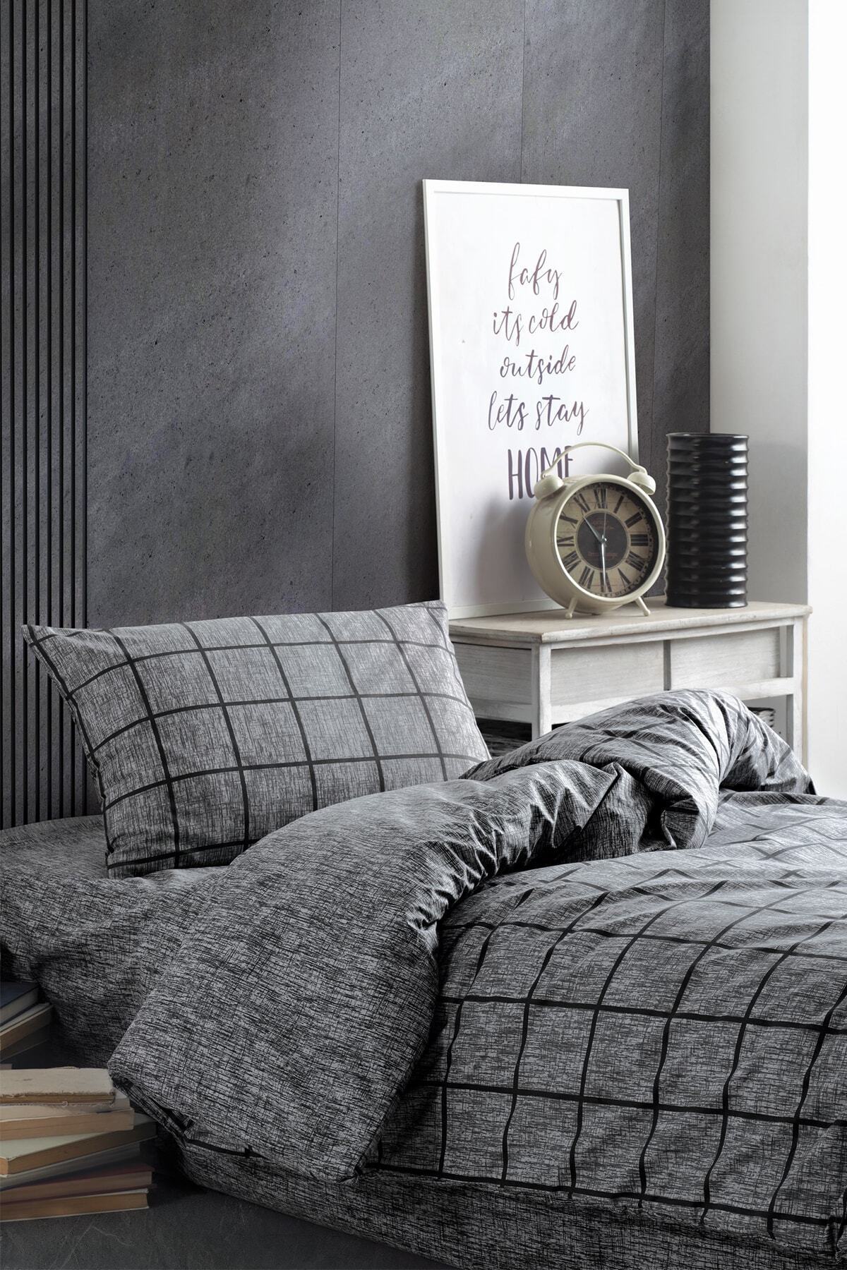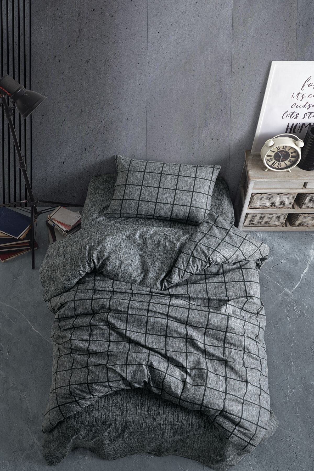 Lotusline Home Minikaro Füme Tek Kişilik Pamuklu Nevresim Seti Çift Taraflı