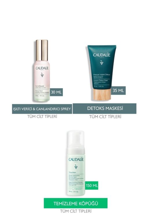 Caudalie Temiz Arınmış Işıltılı Günlük Bakım Seti | Elixir Sprey Kil Maskesi Temizleme Köpük 3 lü set en ucuz fiyata kozmetikara.com sitemizden sipariş verebilirsiniz.