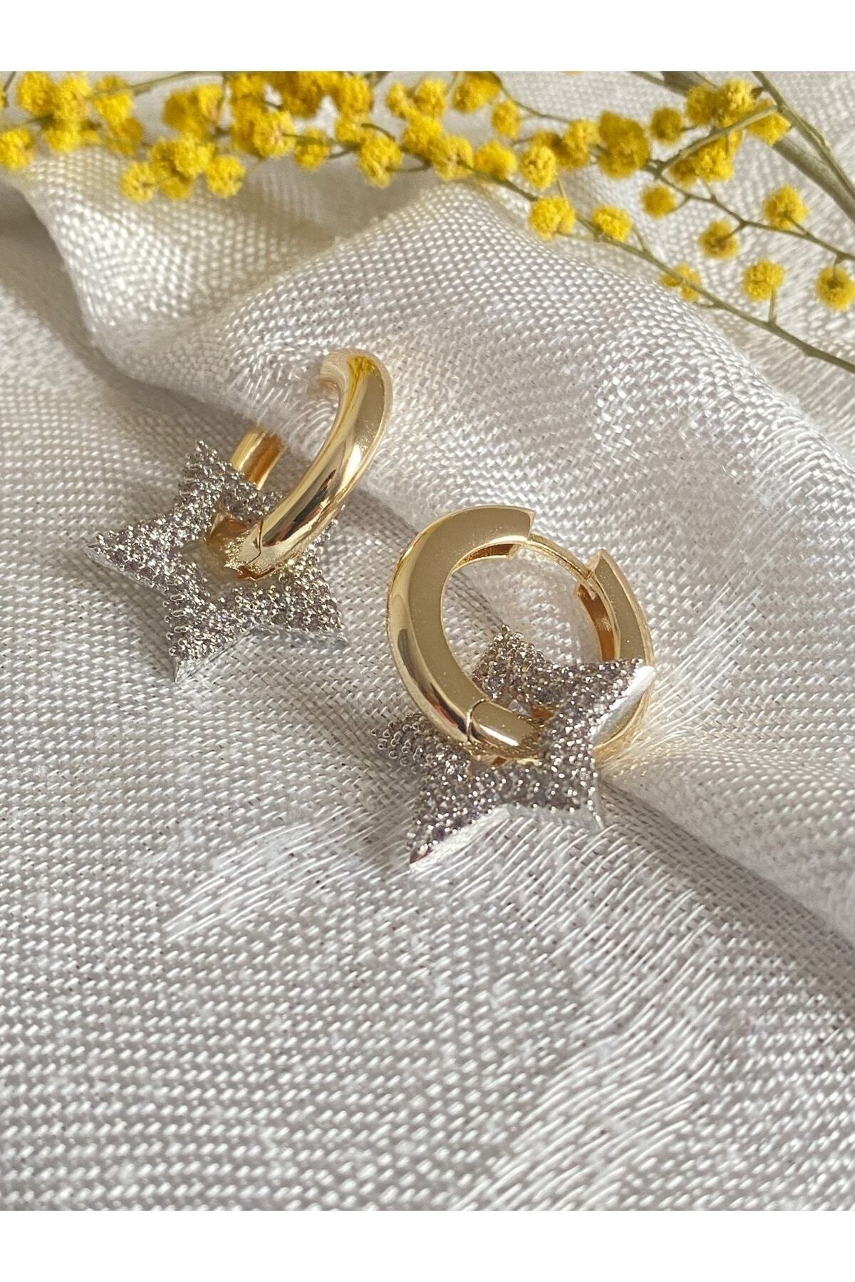 Çelik Gold Halkada Zirkon Kaplı Yıldız Küpe