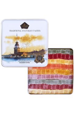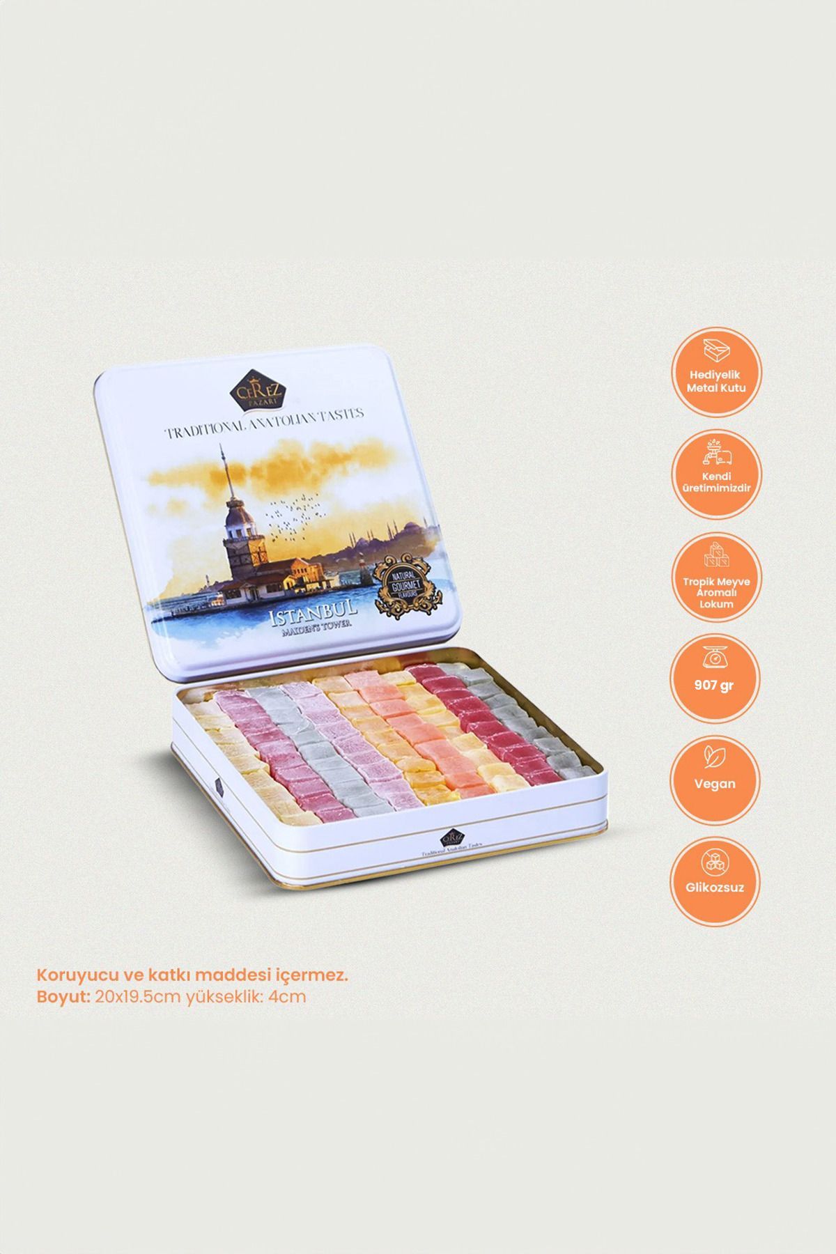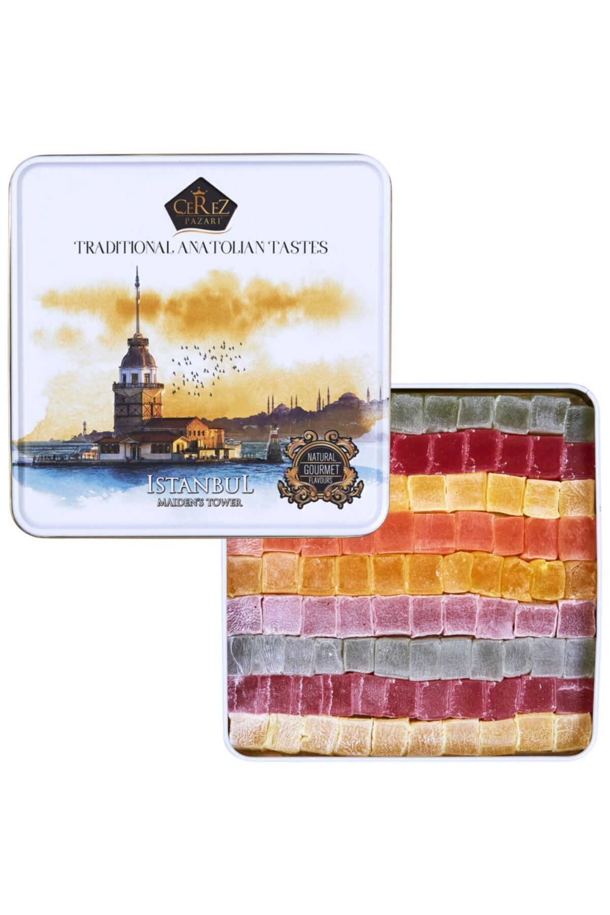 Çerez Pazarı Hediyelik Metal Kutuda Enfes Türk Lokumu 725gr Glutensiz Vegan 6 Çeşit Meyve Aromalı Glikozsuz
