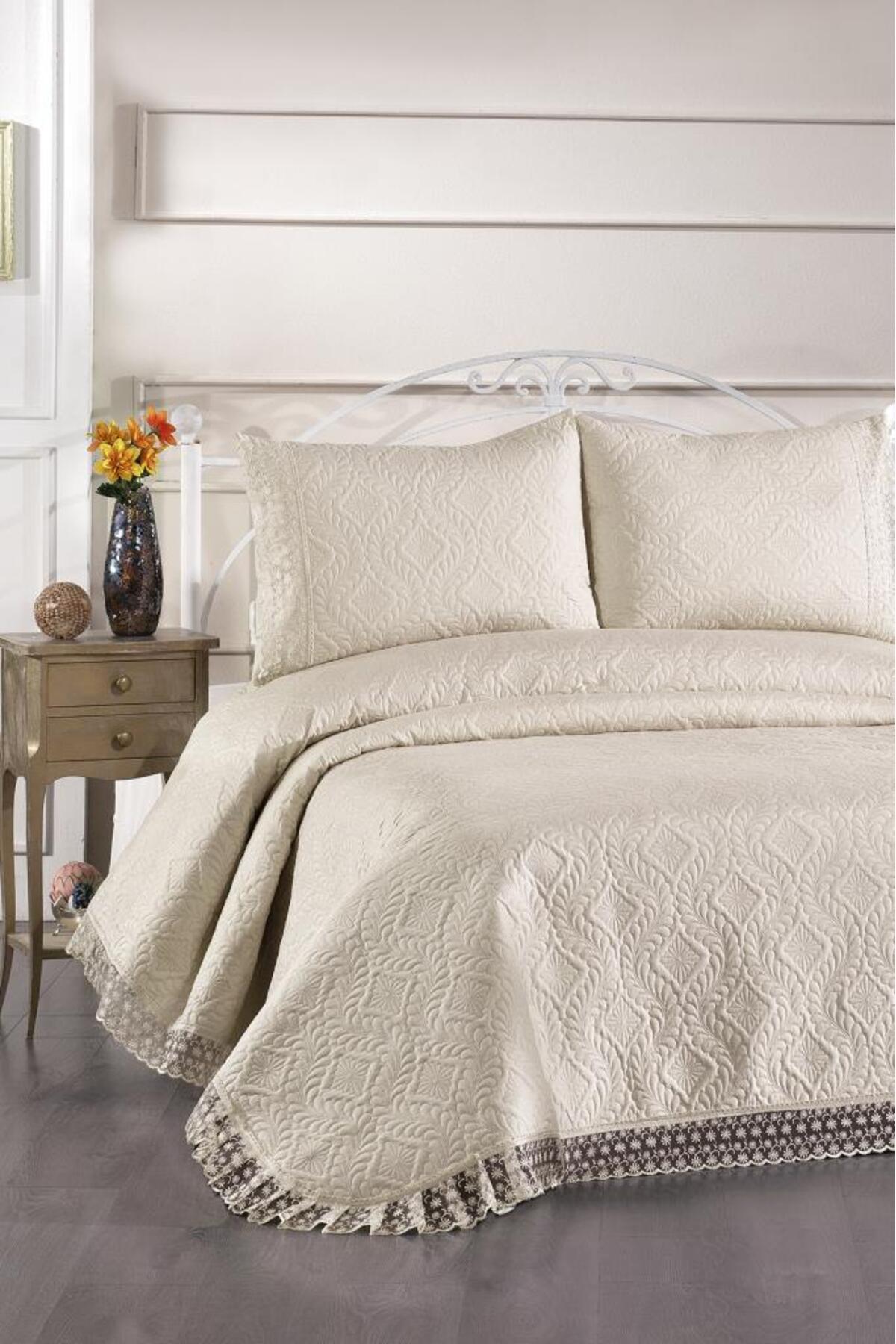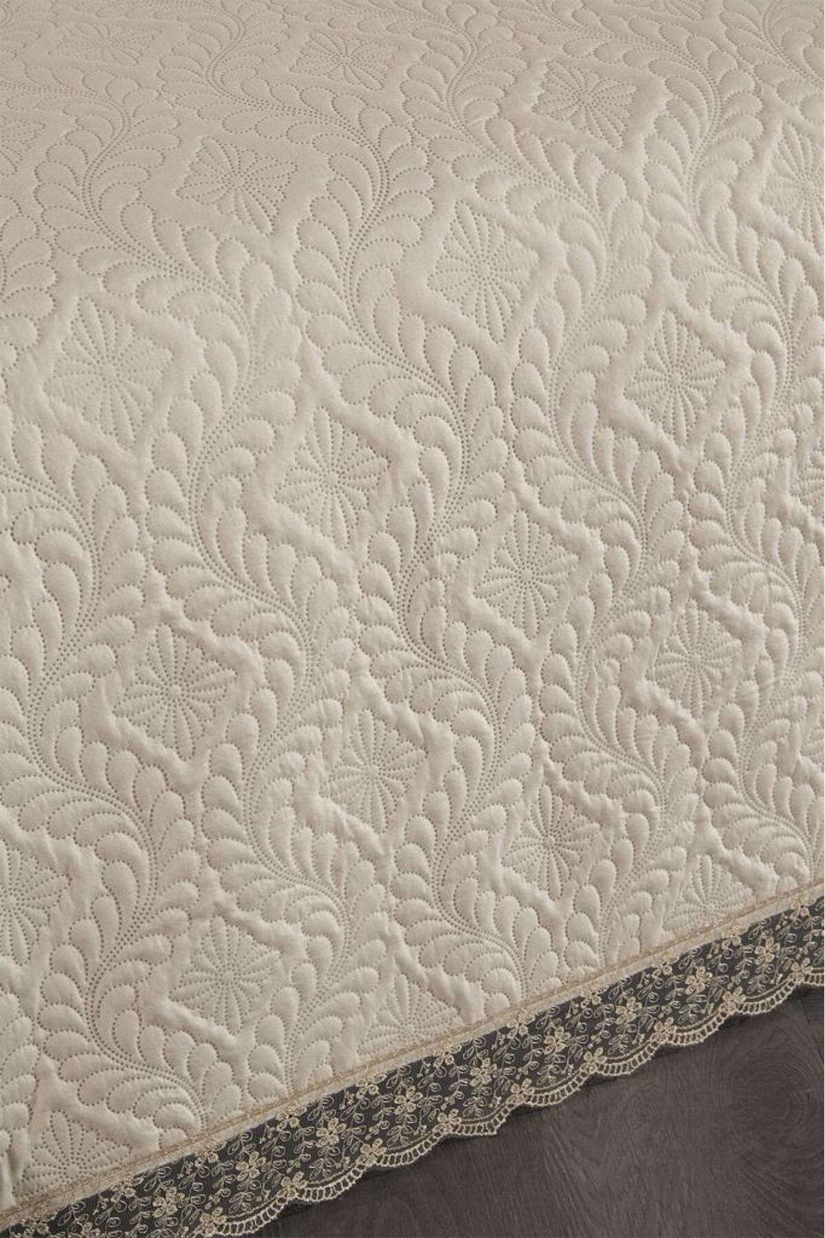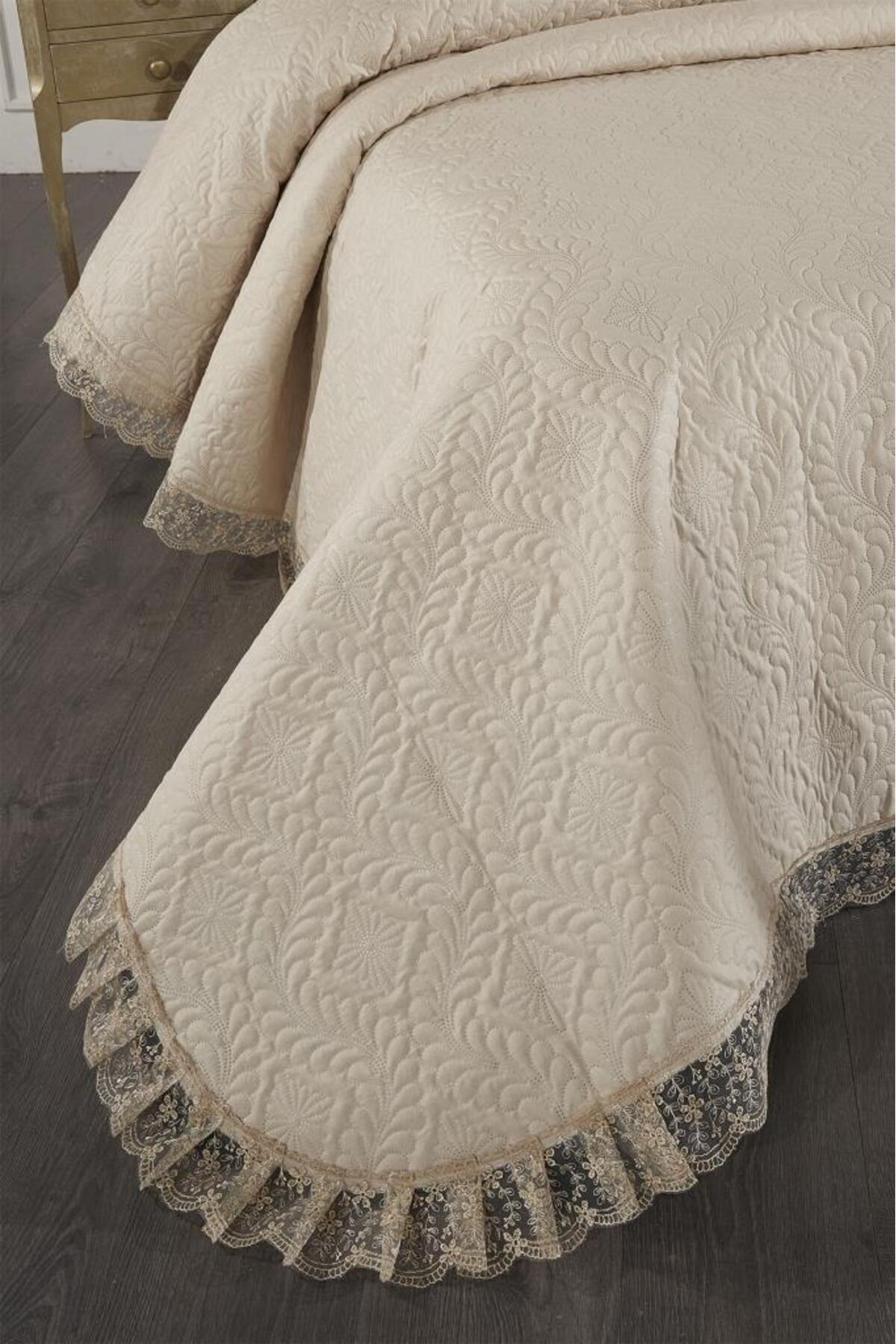 Çeyiz Diyarı Zoya Dantelli Kapitoneli Ultrasonik Çift Kişilik Yatak Örtüsü Bej