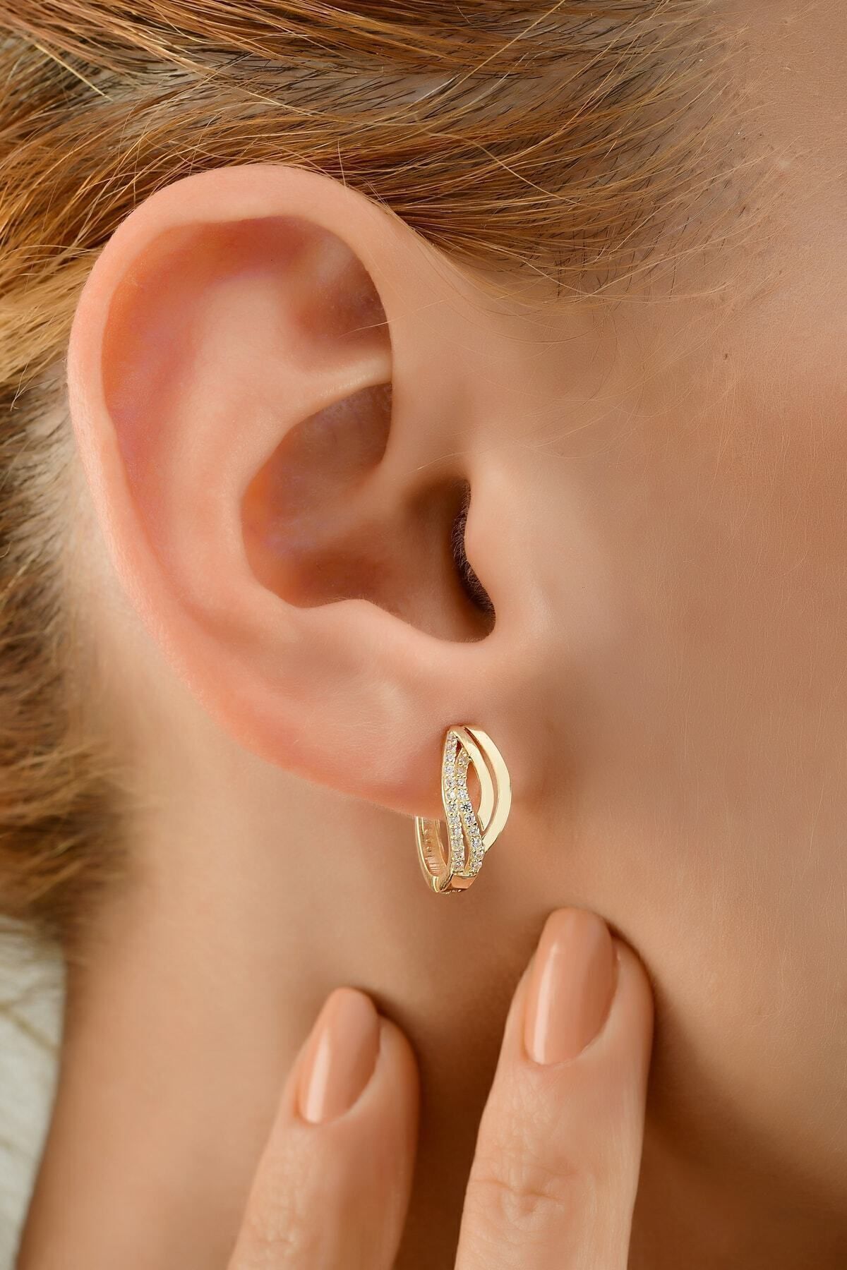 Çgk Çiğdem Gürel Kuyumculuk ÇGK “Swan” 8 Ayar Altın Zarif Tasarım Küpe – Kadın, Taşlı & Kavis Form