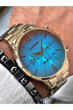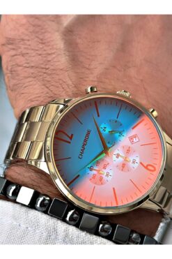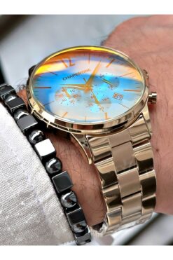 Chaperone Altın Renk Renkli Cam Fonksiyonlar Aktif Çelik Kordon Erkek Kol Saati + BİLEKLİK HEDİYELİ By Reward