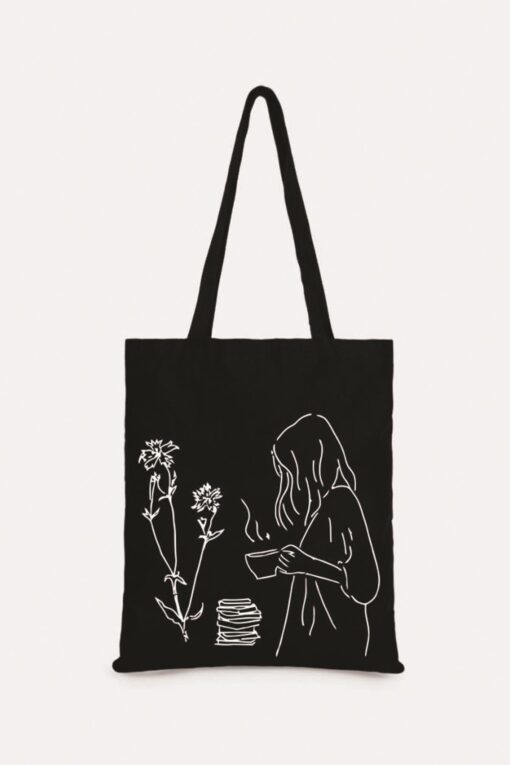 Çiçek Kitap Kahve İçen Kız baskılı siyah bez çanta.