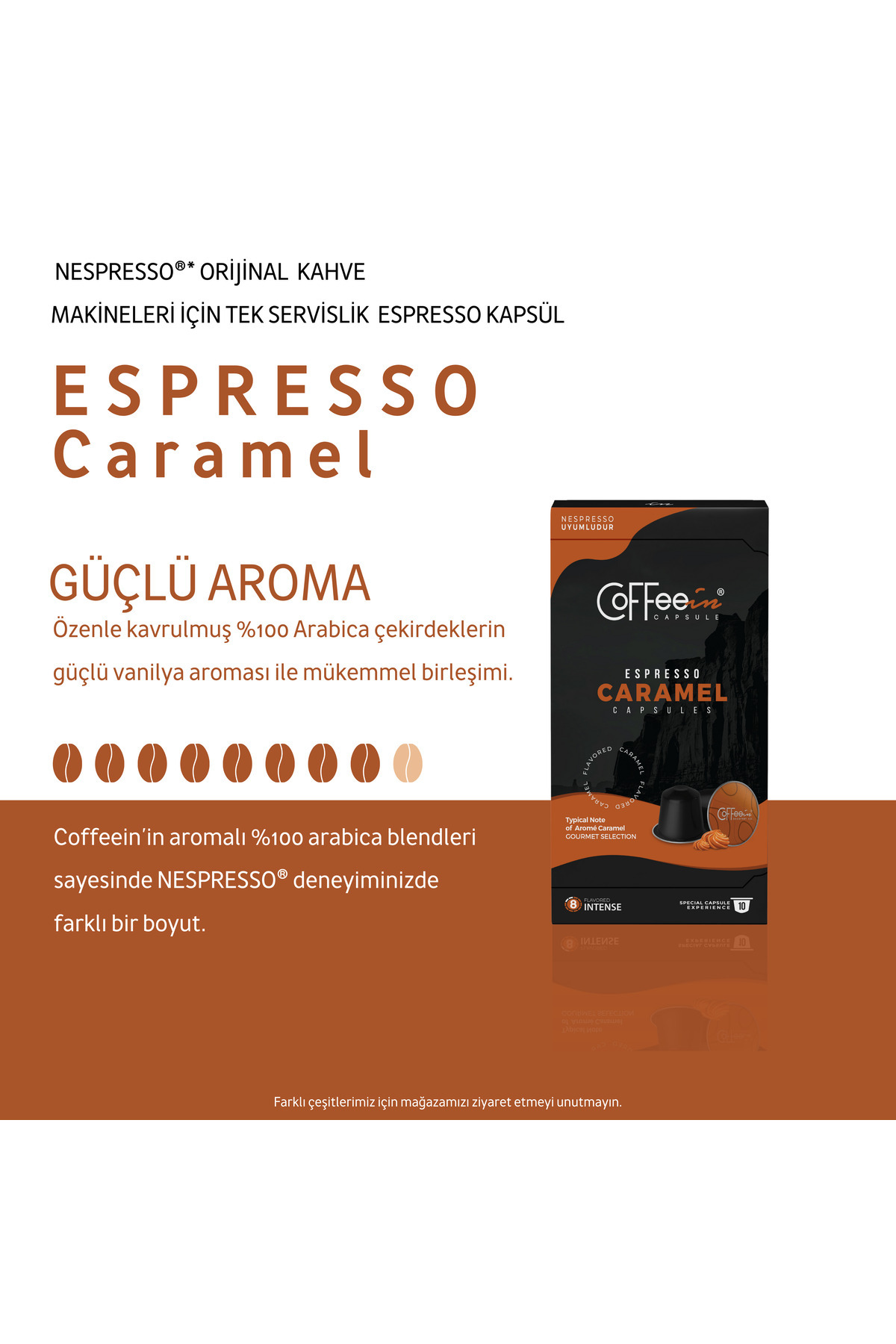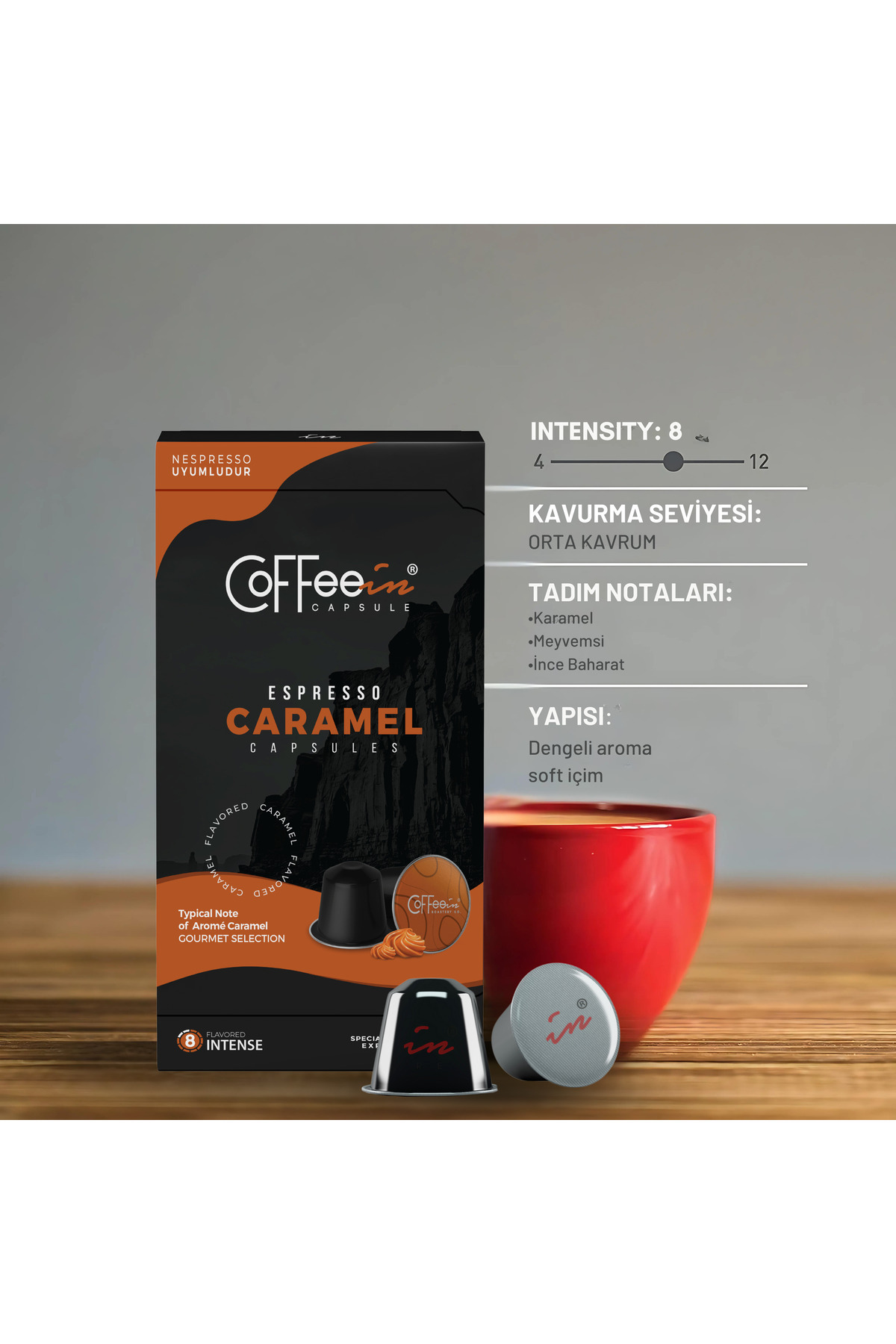 Coffeein Espresso Karamel Aromalı Kapsül Kahve – 10'lu Nespresso Uyumlu Kapsüller, %100 Arabica ürünü ucuz fiyat, hızlı kargo imkanı ile hemen sitemizden sipariş verin.