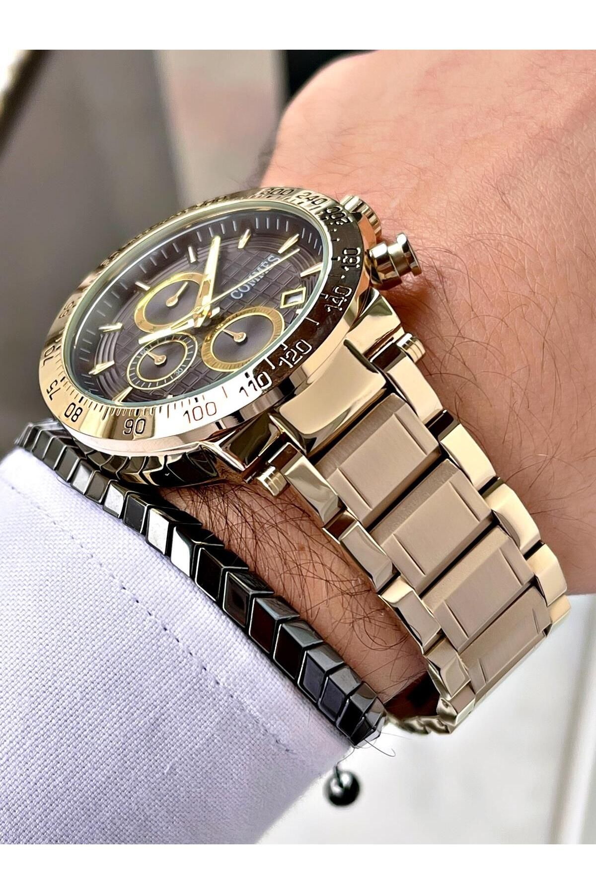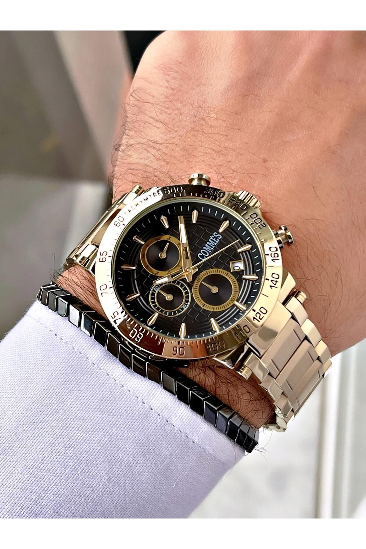 COMMES Çelik Kordon Kronometre Ve Takvimli Altın Siyah Renk Unisex Klasik Kol Saati Cm1904-ggb