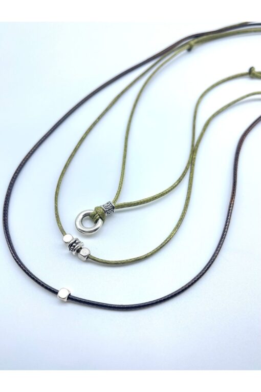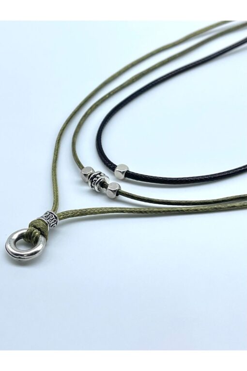 Concept HuBuTU Minimal Gümüş Kaplama Objeli Erkek Siyah Suni Deri Ip Bohem Kolye Seti (3 ADET)