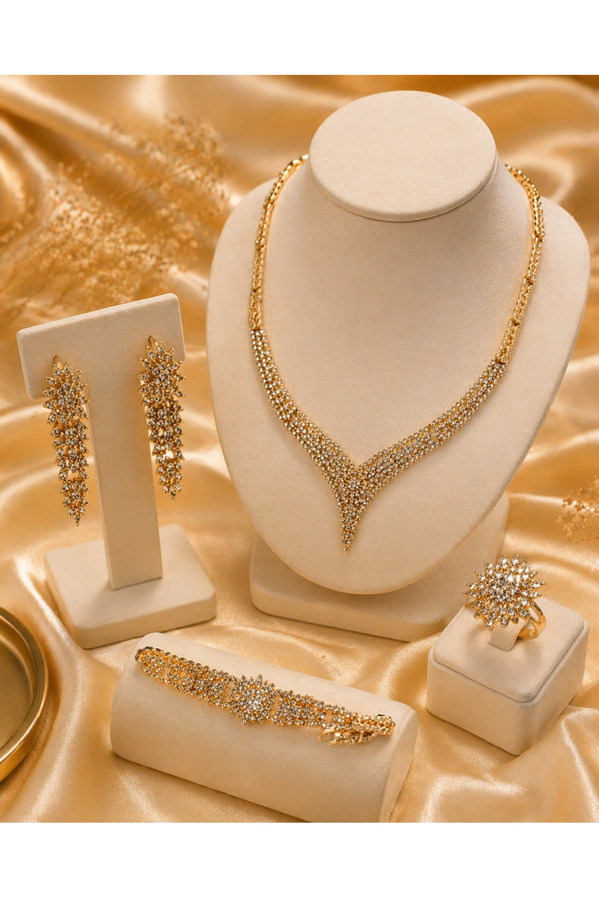 Constanza Exclusive Glamora Altın Kaplama Zirkon 4’lü Kolye Bileklik Küpe Yüzük Özel Tasarım Takı Seti Düğün Hediye