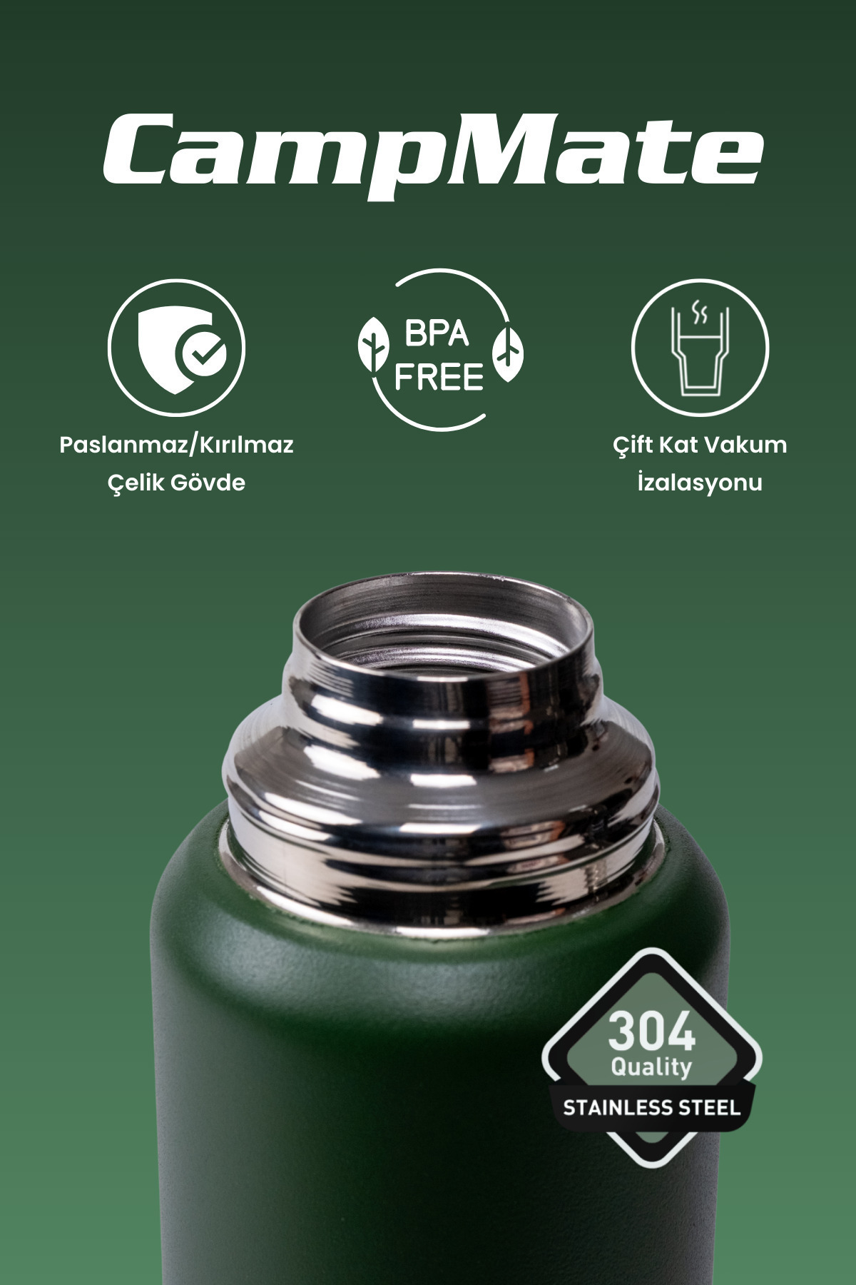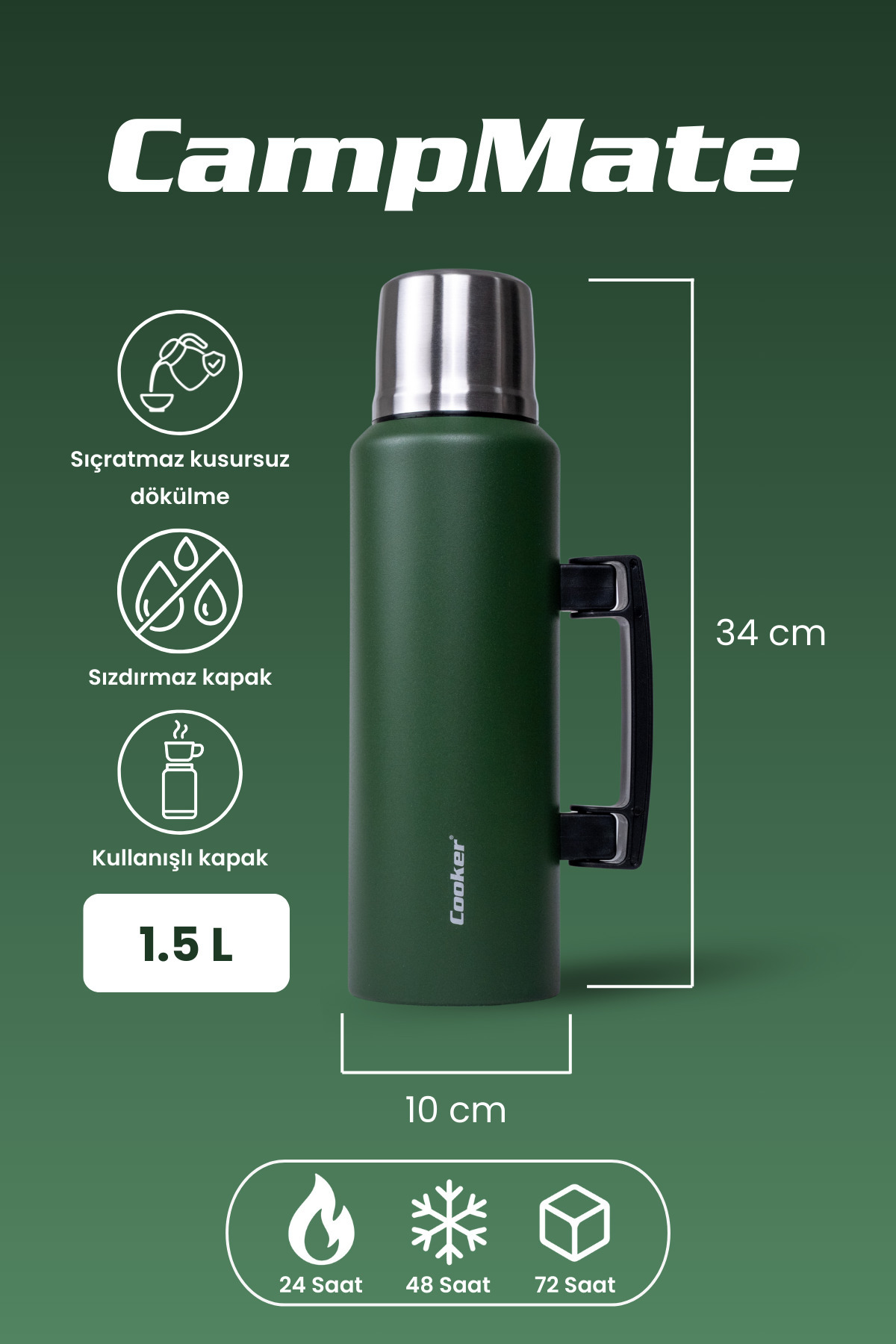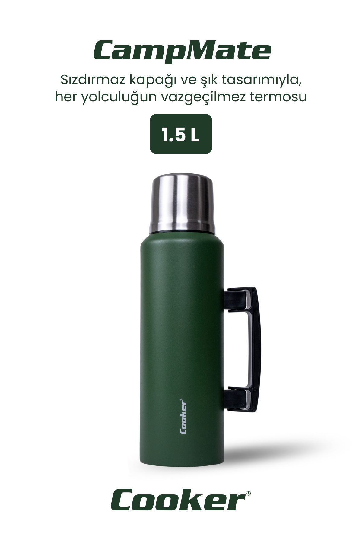 Cooker 1.5 Litre Çift Katlı Çelik Termos-24 Saat Sıcak, 48 Saat Soğuk, Kulplu (Kamp, Piknik, Ofis, Seyahat)