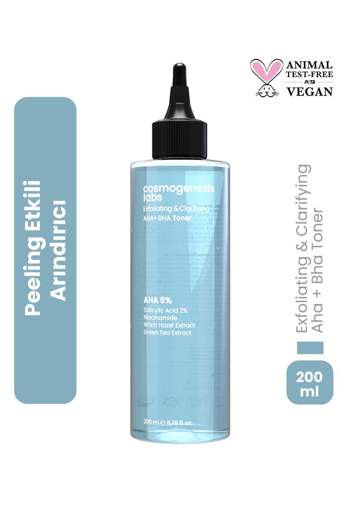 Cosmogenesis Labs Aha %5 Bha %2 Peeling Etkili Tonik 200 ml – Arındırıcı Gözenek Sıkılaştırıcı Ph Dengeleyici Vegan