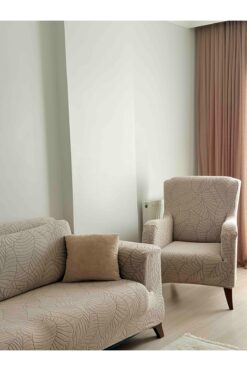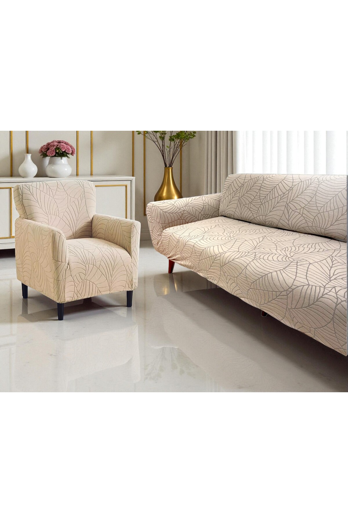 coverbox Jakarlı yaprak desen Lastikli Koltuk Örtüsü Takımı 3+3+1+1 Kaymaz Yıkanabilir Kanepe Kılıfı
