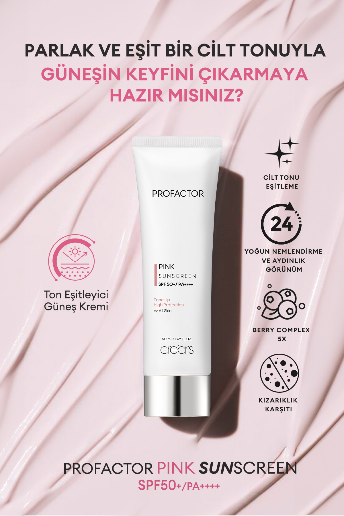 Cre’ars 5 Farklı Bitki Kompleksli Ton Eşitleyici Güneş Kremi Cre’ars Profactor Pink Sunscreen SPF50+/PA++++