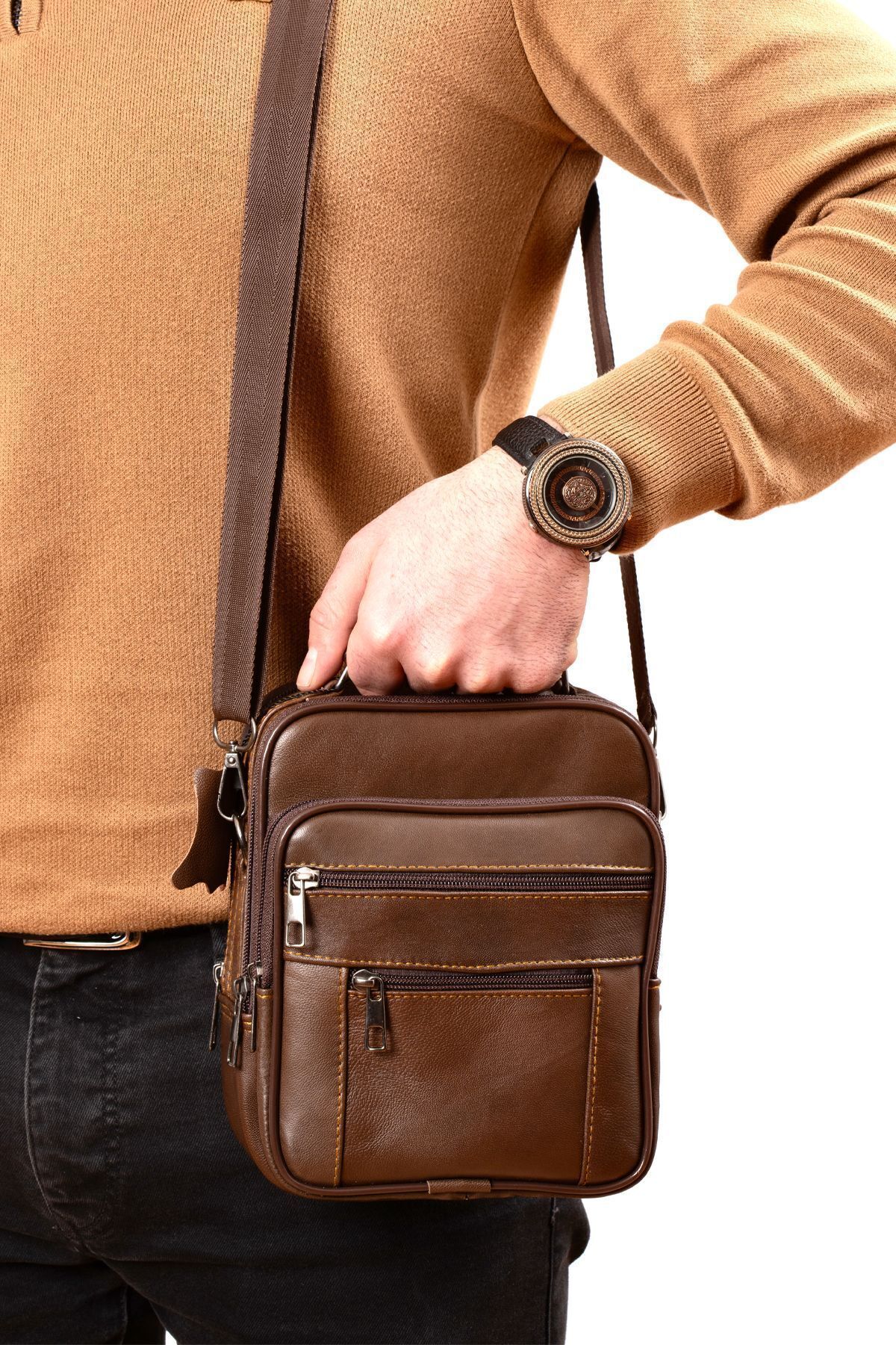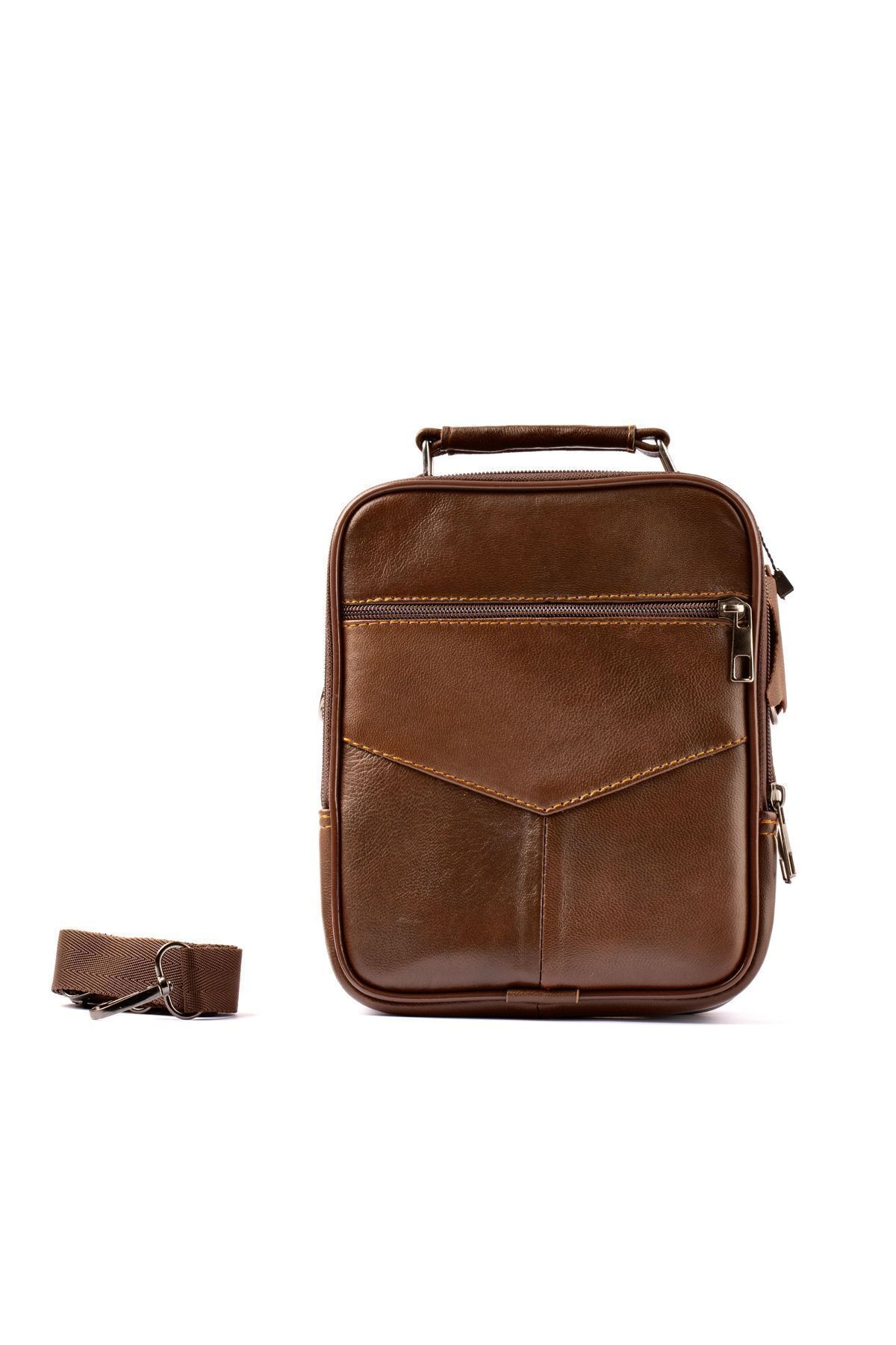 CüzCan Erkek Kahverengi Çelik Kasalı Hakiki Deri El Ve Omuz Çantası Orta Boy Babalar Günü Hediyesi