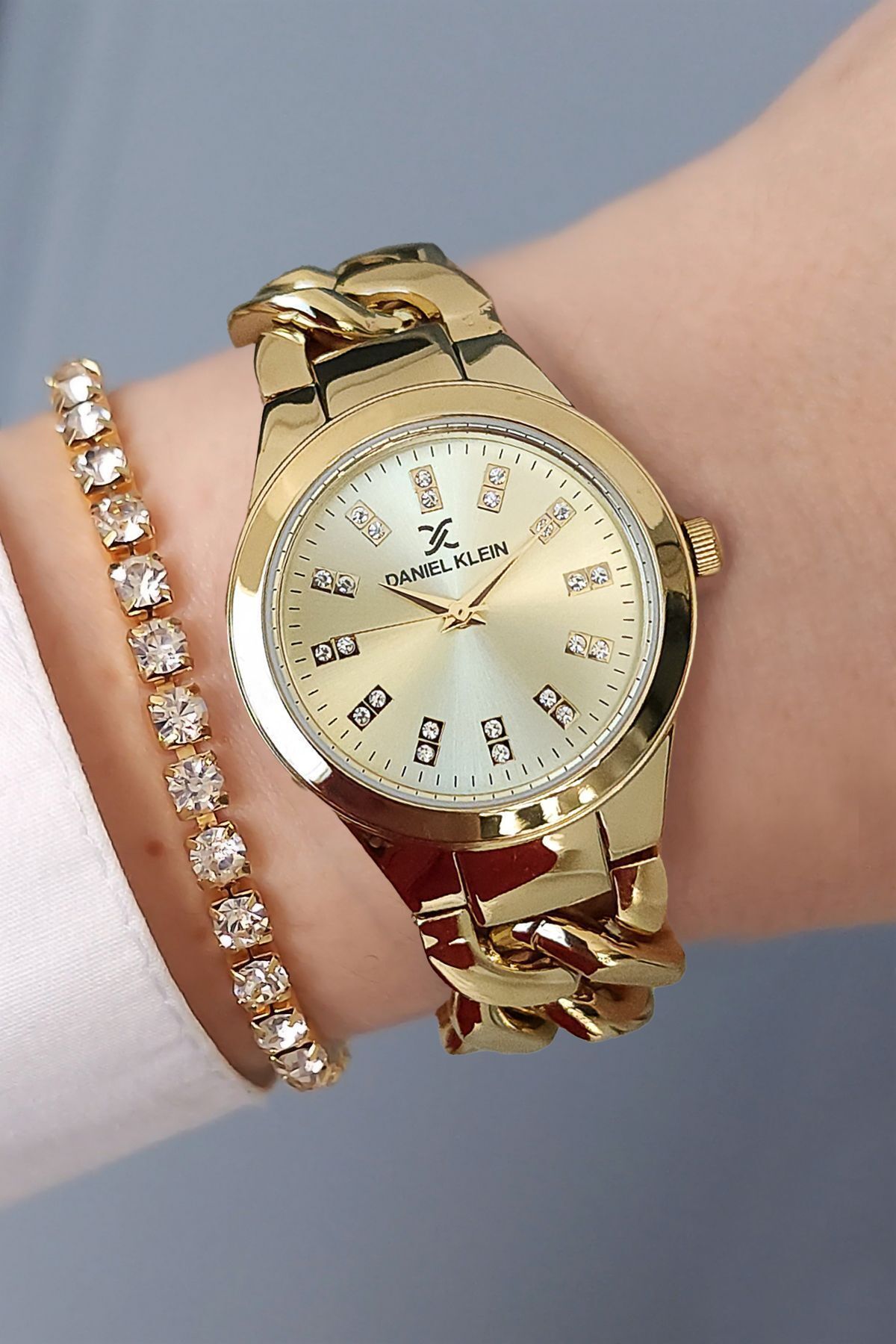 Daniel Klein Altın Sarısı Zincirli Kadın Kol Saati, Zirkon Taşlı Bileklik Hediyeli ürünü ucuz fiyat, hızlı kargo imkanı ile hemen sitemizden sipariş verin.
