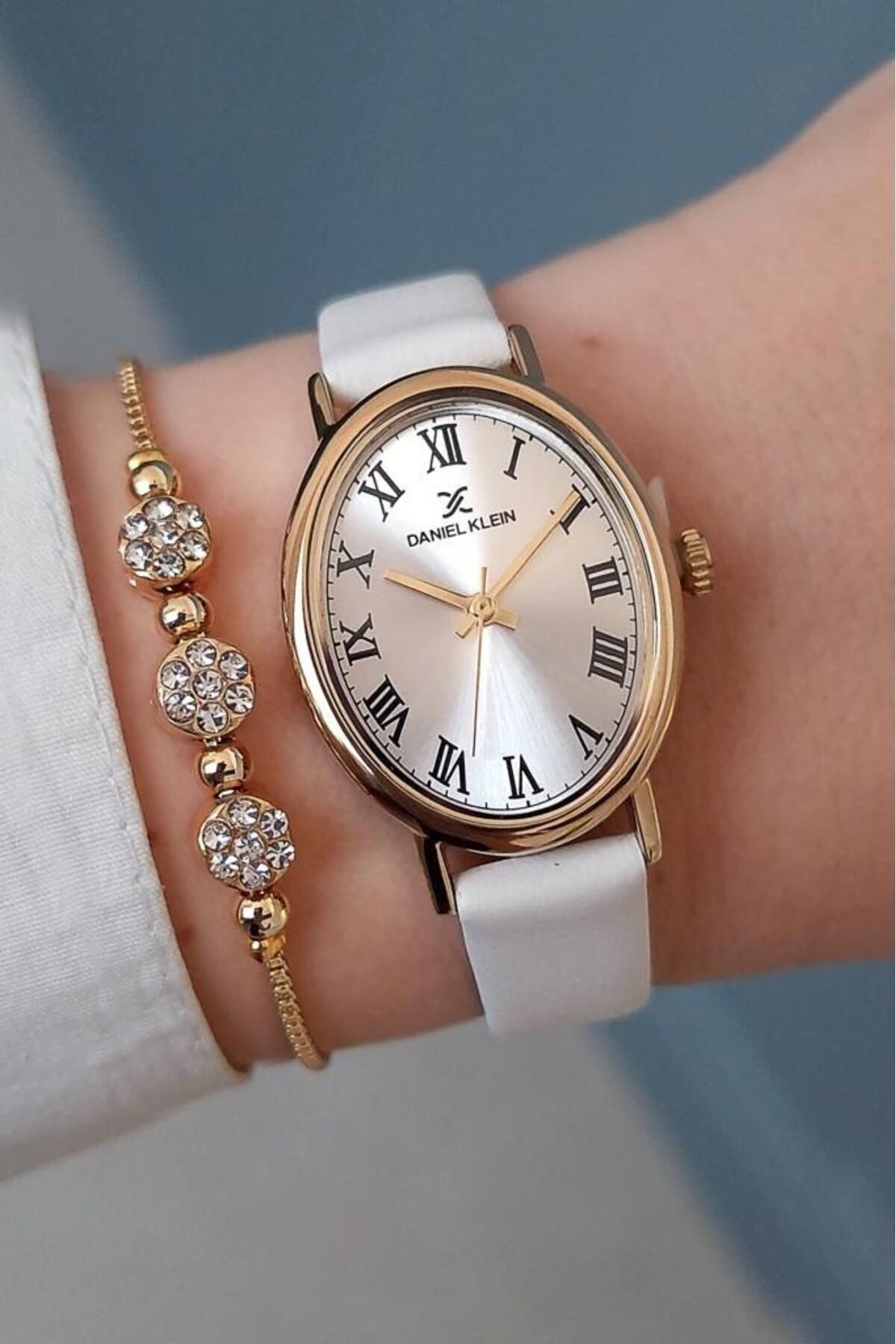 Daniel Klein Beyaz Deri Kayışlı Kadın Kol Saati + Taşlı Bileklik