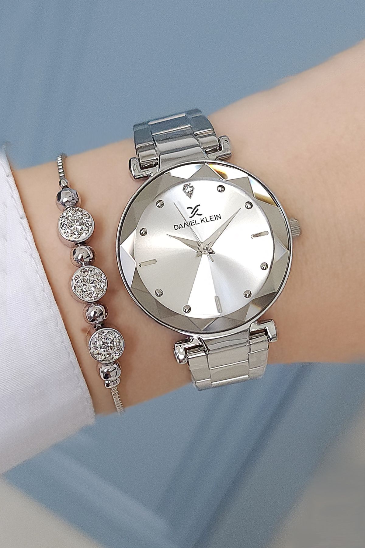 Daniel Klein Kesme Camlı Metalik Kadın Kol Saati + Zirkon Taşlı Bileklik Seti