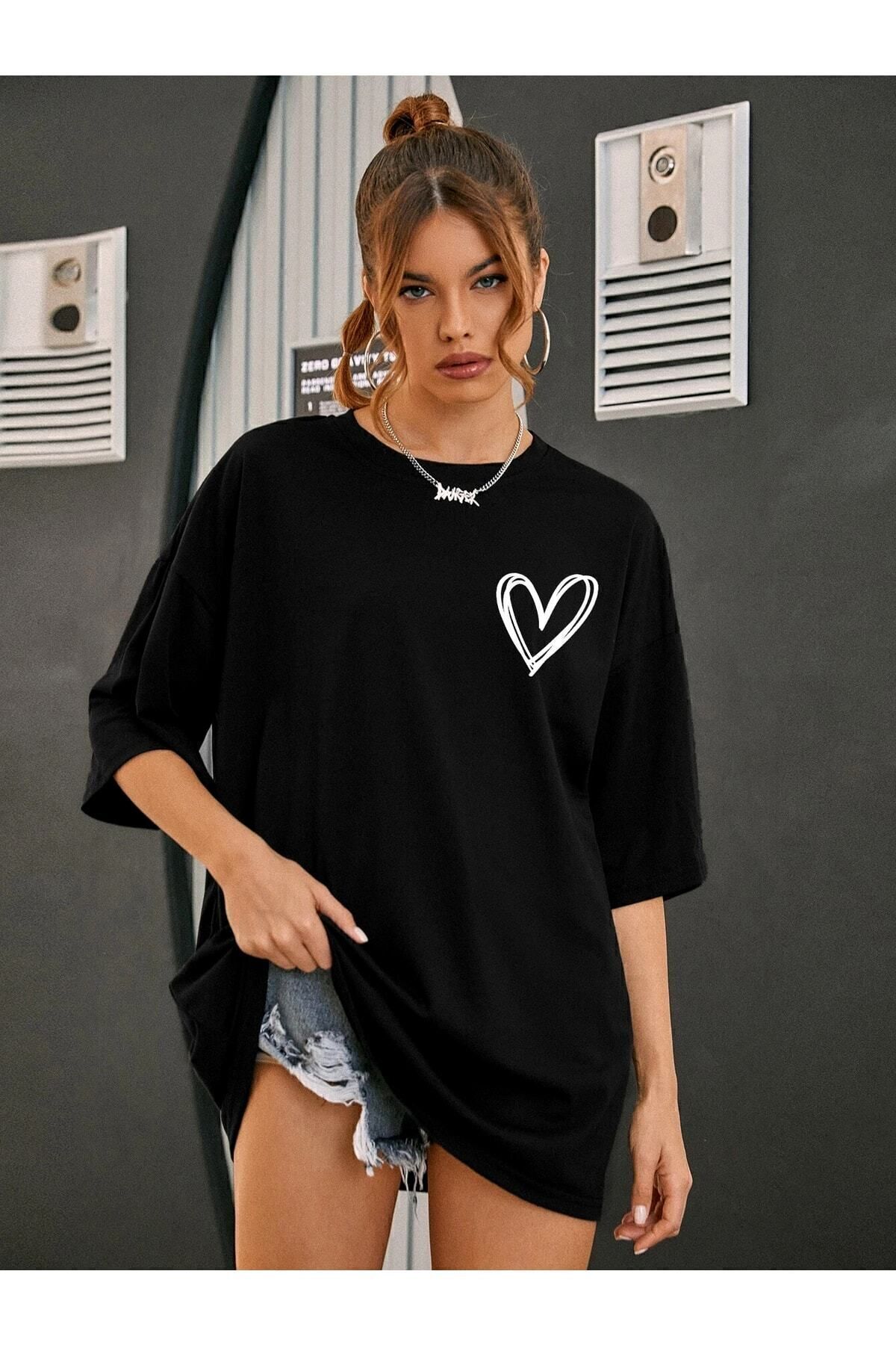 DAXİS Sportwear Company Kadın Küçük Kalp Baskılı Oversize Tshirt