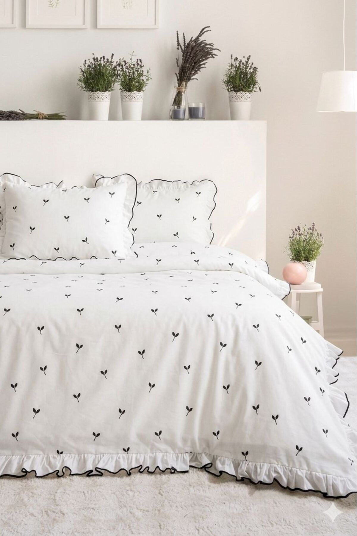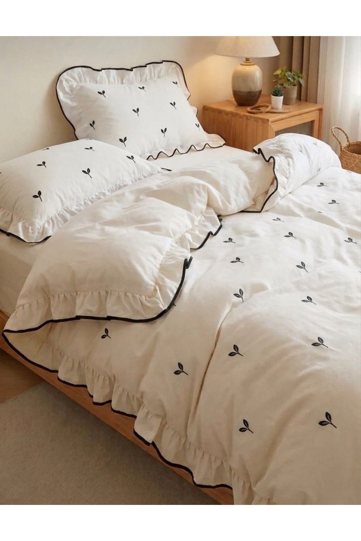 DB Çift Kişilik Nevresim Seti %100 Pamuklu Yaprak Desenli Süs Overloklu Fırfırlı