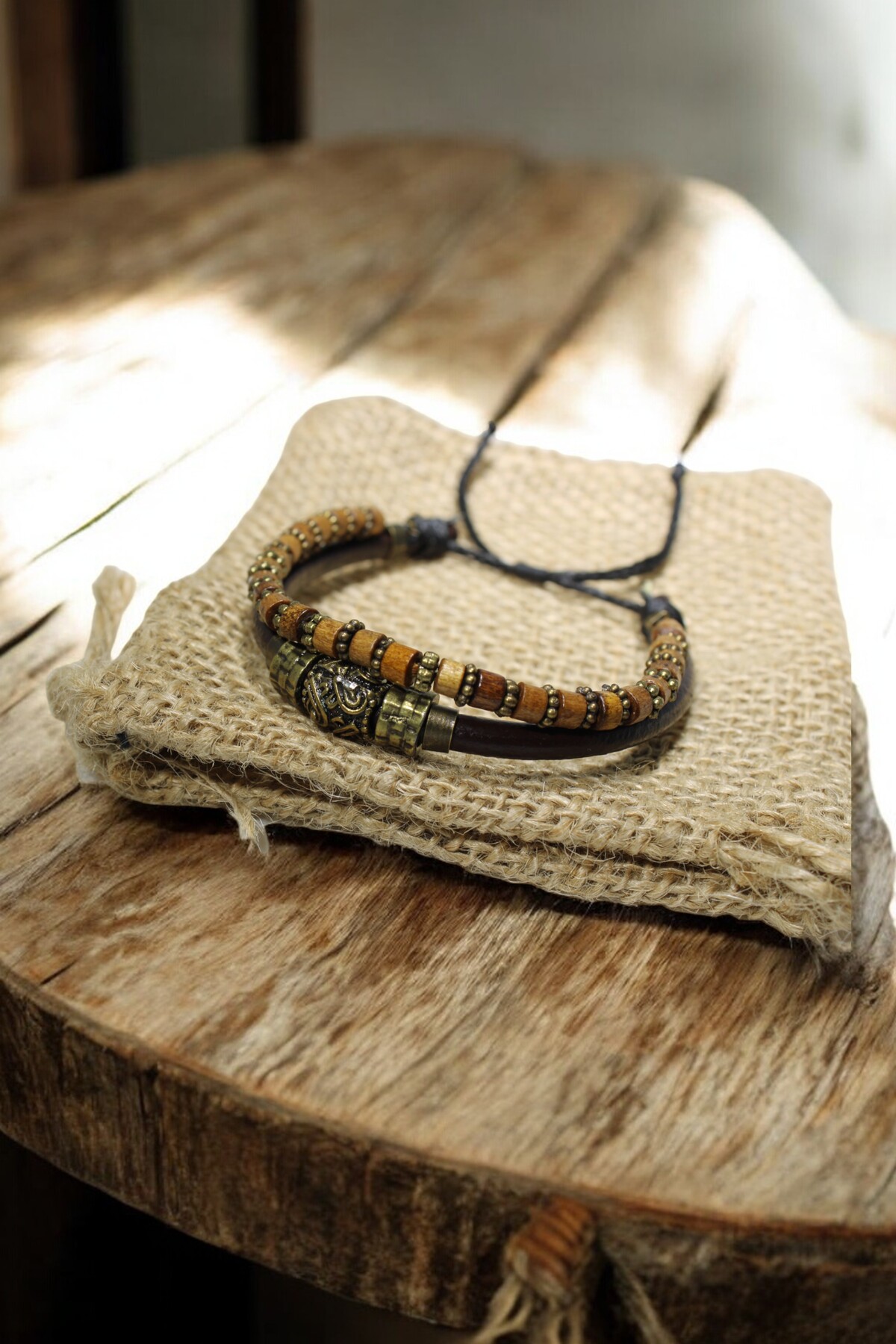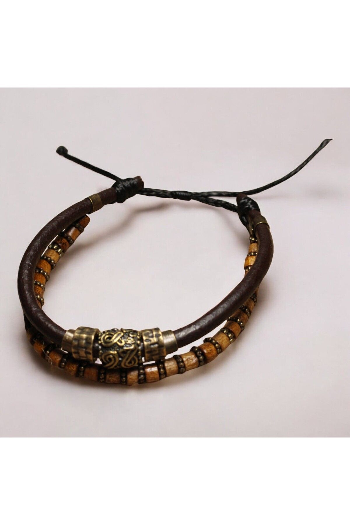 DEHNA Antik Desenli Metal Figürlü Kahverengi Deri Ve Ahşap Boncuklu Iki Parça Bileklik