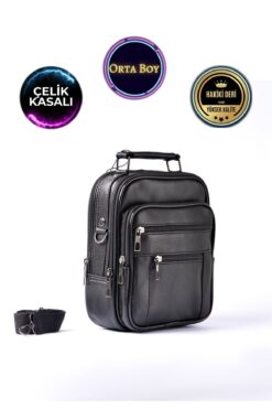 CüzCan Erkek Siyah Çelik Kasalı Hakiki Deri El Ve Omuz Çantası Ayarlanabilir Askılı( Orta Boy)