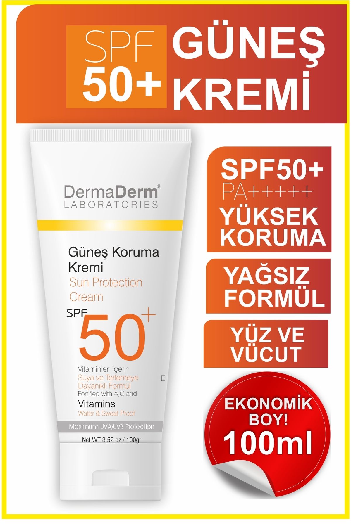 DermaDerm Güneş Koruma Kremi Spf 50 100ml ürünü ucuz fiyat, hızlı kargo ve kredi kartına 12 ay taksit imkanı ile hemen sitemizden sipariş verin.