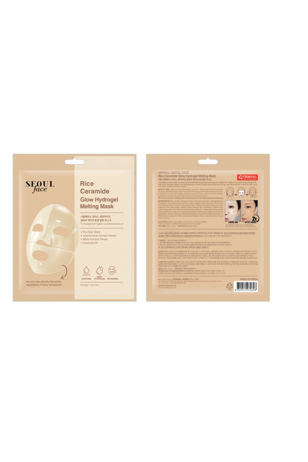 Dermal Seoul Face Pirinç Seramid Hidrojel Nemlendrici Eriyen Kore Maske 34 gr