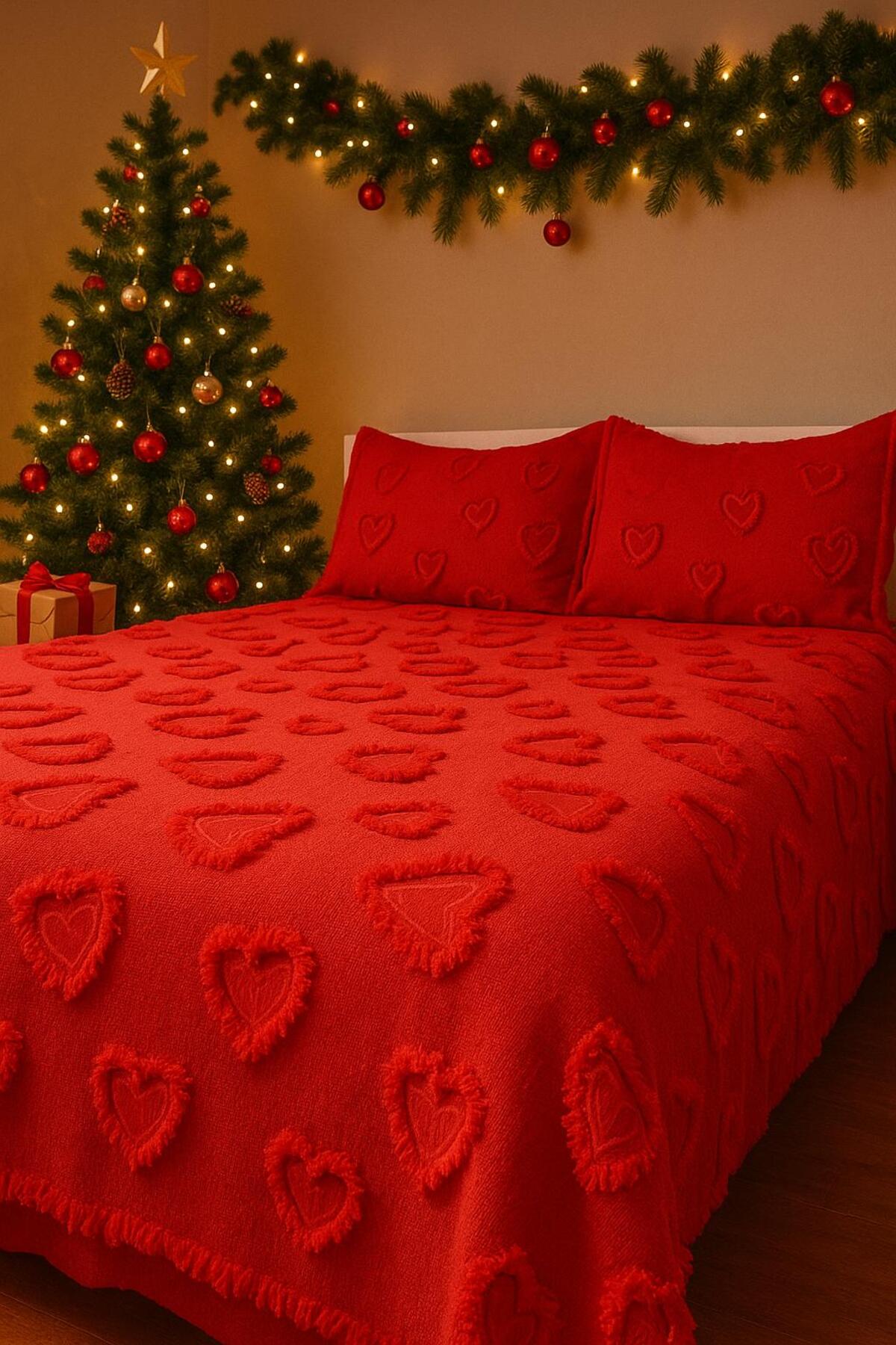 diabella Sevgililer Günü Özel Desen Kalpli 3 Parça Çift Kişilik Yatak Örtüsü Kırmızı
