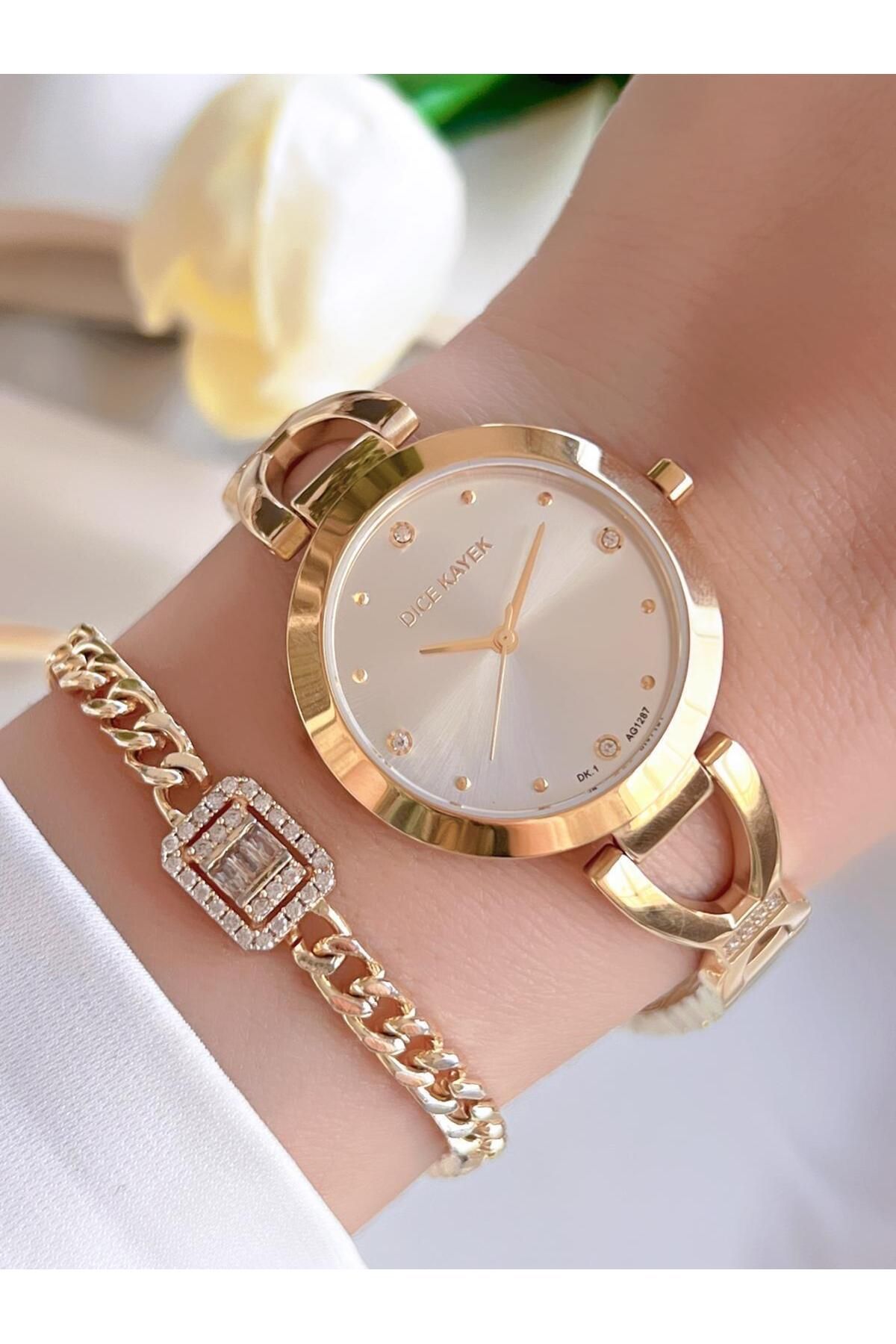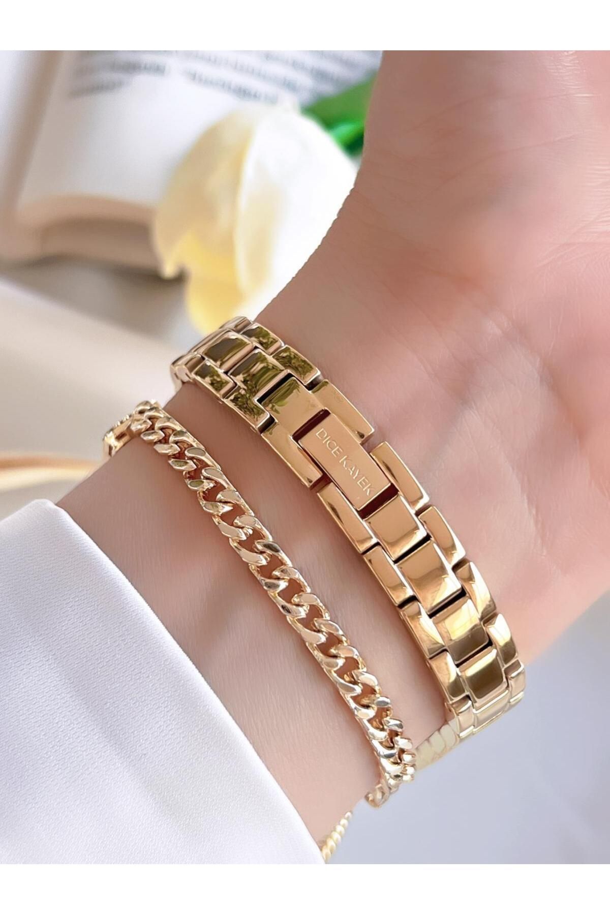 Dice Kayek Çelik Kordon Çelik Kasa Kararma Renk Atma Yapmaz Kadın Kol Saati+Bileklik AG1287.02