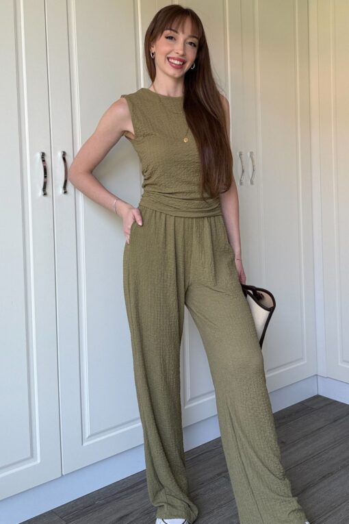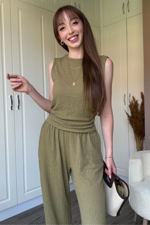 Dilay Gökoğlu Butik Haki Gofre Bisiklet Yaka Takım