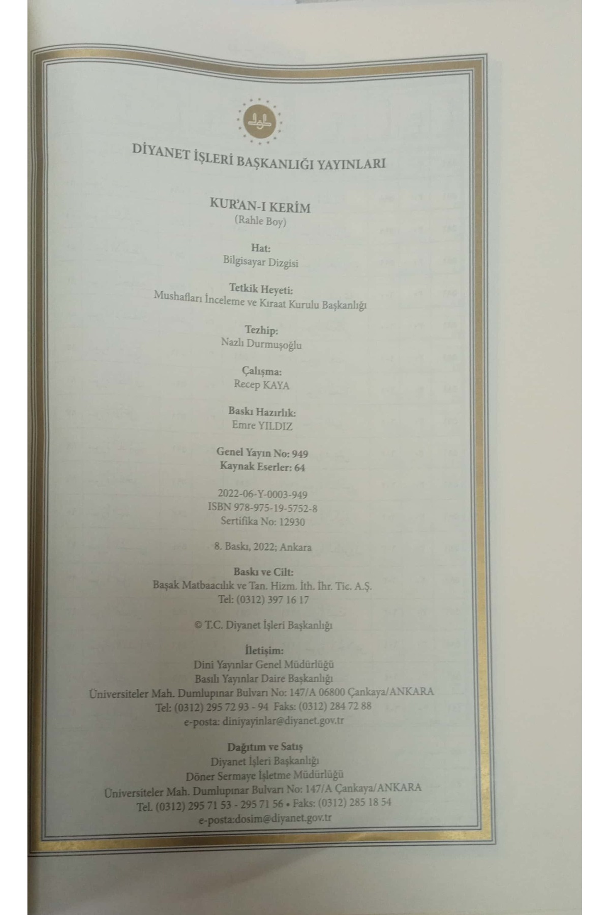 Diyanet İşleri Başkanlığı Kur’an-ı Kerim Bilgisayar Hatlı (RAHLE BOY) 19*28 Cm