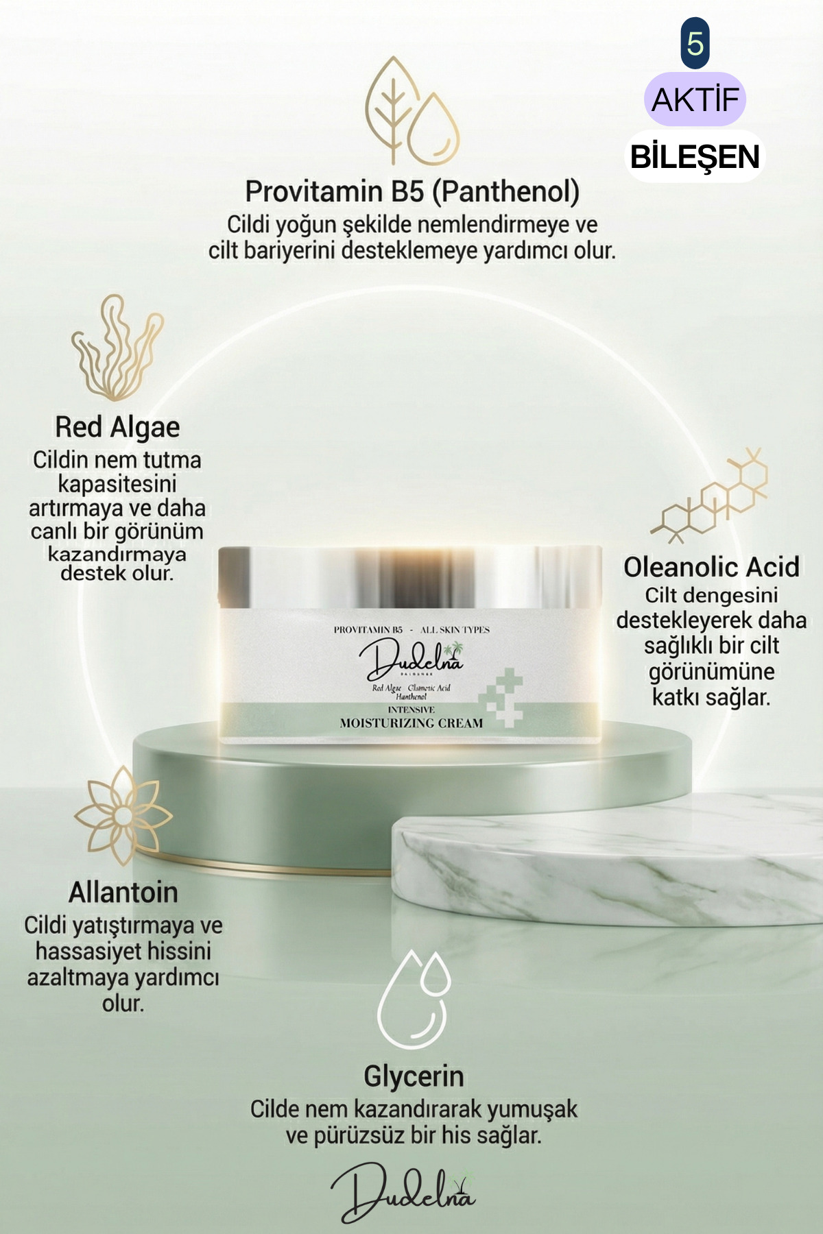 DUDELNA Yoğun Nemlendirici Yüz & Cilt Kremi – ProVitamin B5 | Tüm Cilt Tipleri | Kırmızı Yosun & Allantoin