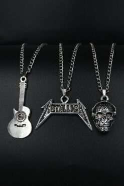 Dukkanka 3’lü Klasik Gitar, Metallica Ve Müzik Dinleyen Kurukafa Gümüş Renk Kolye Seti