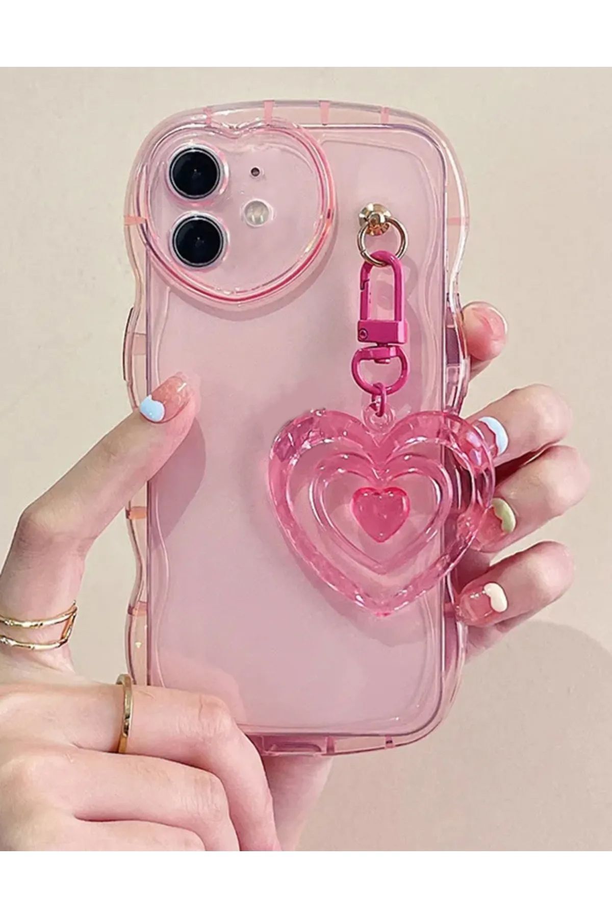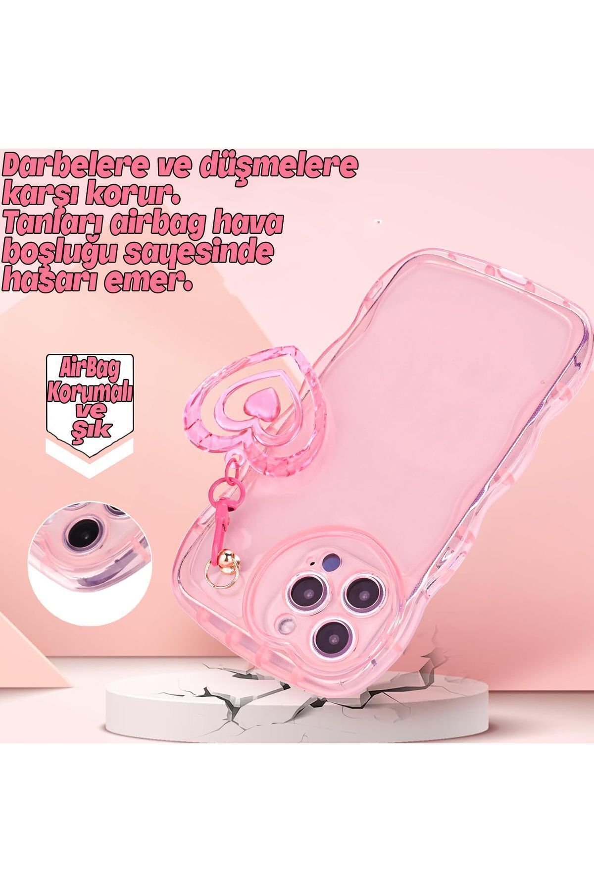 EDELFU İphone 11 Pembe Renk Şeffaf Yanları Darbeye Dayanıklı Ve Sevimli Kalp Aparatlı Silikon Kılıf