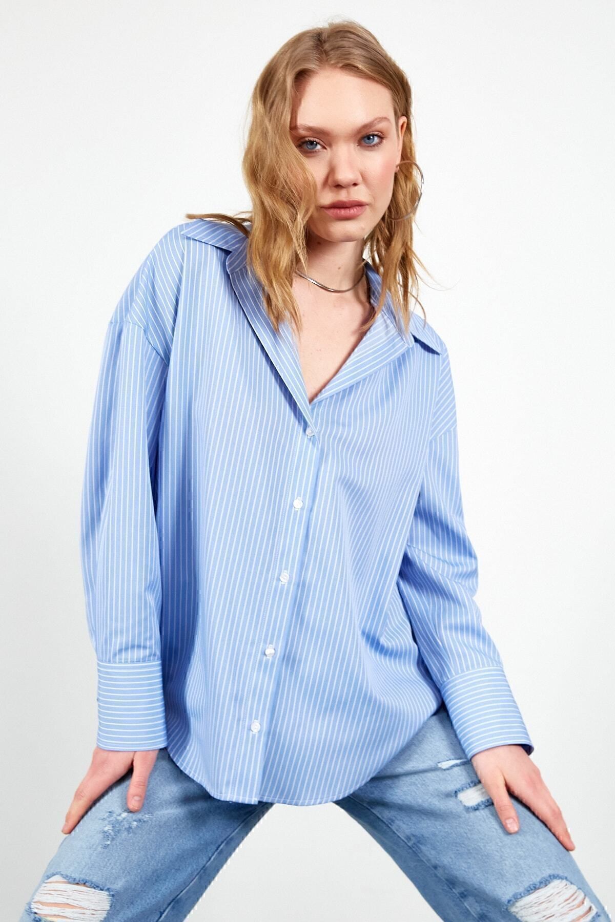 Ana Sayfa » kozmetikara.com » Giyim » Üst Giyim » Gömlek » EDITION Mavi Ince Çizgili Pamuk Oversize Rahat Kalıp Kadın Basic Gömlek | Ek334864-7432