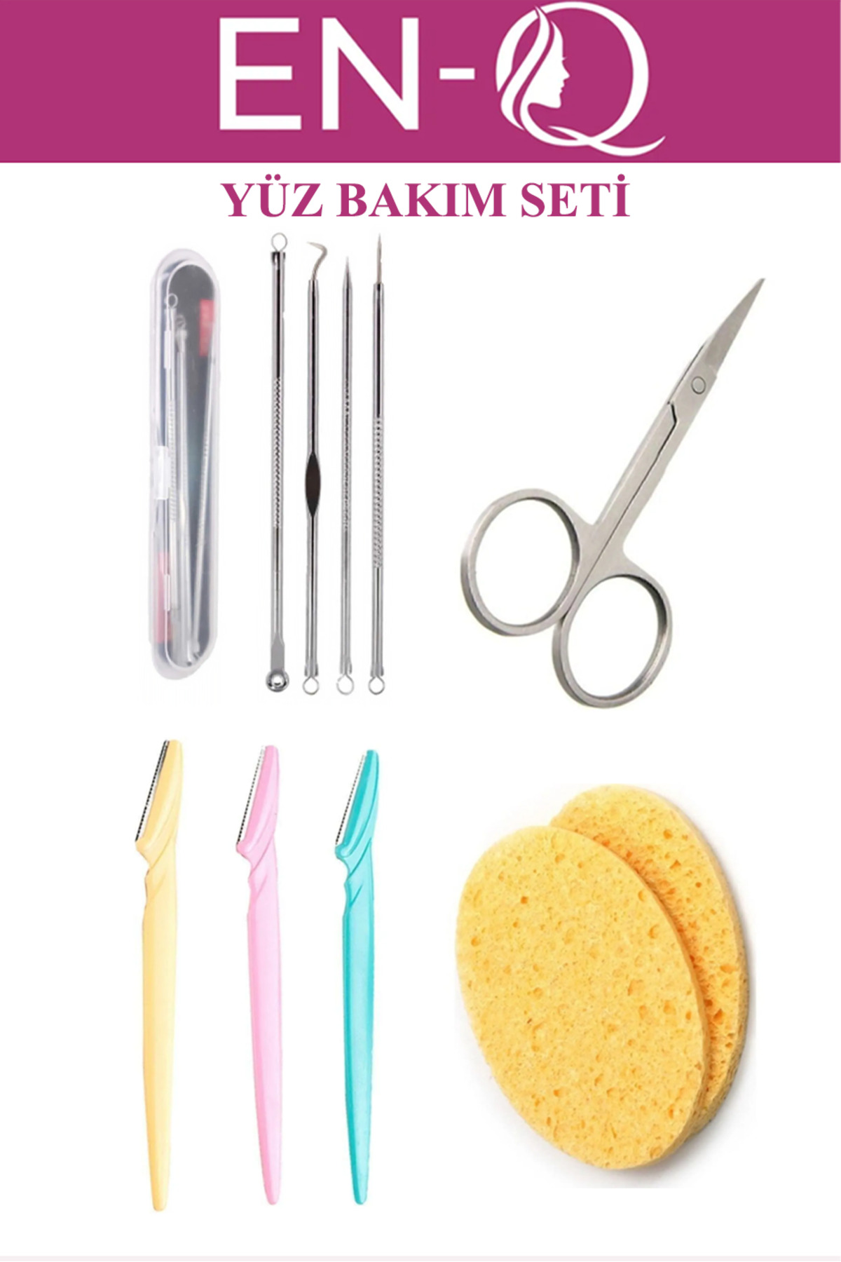ENQ 4'Lü Yüz Bakım Seti - Kaş Usturası, Kaş Bıyık Makası,4lü Komedon ve Yüz Yıkama Süngeri ürünü ucuz fiyat, hızlı kargo imkanı ile hemen sitemizden sipariş verin.