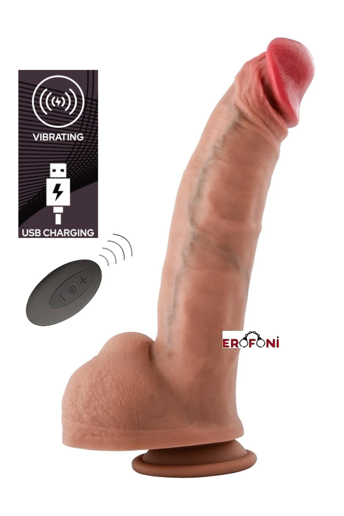 Erofoni Usb Şarjlı Uzaktan Kumandalı Titreşimli 29 Cm Çift Katmanlı Dildo Premium Vantuzlu Vibratör Penis